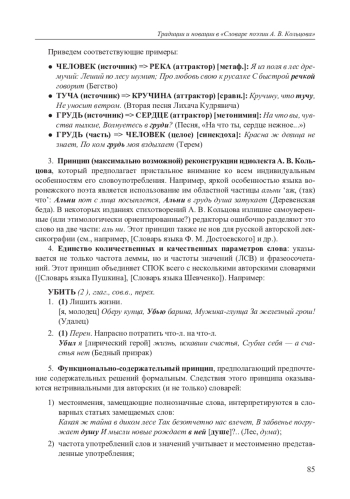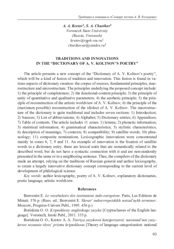В статье излагается новая концепция «Словаря поэзии А. В. Кольцова», который будет представлять собой своеобразный сплав традиционности и инновационности. Этот сплав обнаруживается в различных аспектах создания словаря: корпусе источников, основополагающих принципах, макроструктуре и микроструктуре. К принципам, лежащим в основе предлагаемой концепции, относятся: 1) принцип полноты; 2) функционально-содержательный принцип; 3) принцип единства количественных и качественных параметров; 4) эстетический принцип; 5) принцип реконструкции художественного мировидения А. В. Кольцова; 6) принцип (максимально возможной) реконструкции идиолекта А. В. Кольцова. Макроструктура словаря вполне традиционна и включает в себя семь разделов: 1) Введение; 2) Источники; 3) Список сокращений; 4) Азбука; 5) Словарные статьи; 6) Приложения; 7) Оглавление. Словарная статья включает 11 зон: 1) лемма; 2) фонетическая информация; 3) статистическая информация; 4) грамматическая характеристика; 5) стилистическая характеристика; 6) описание значений; 7) контексты; 8) сочетаемость; 9) слова-спутники; 10) фразеология; 11) составные номинации. Лексикографические инновации оказались сконцентрированы в основном в зонах 6, 7, 9 и 11. Примером инновации может служить фиксация в словарной статье слов-спутников — лексических единиц, семантически связанных с описываемым словом, но не имеющих с ним синтаксической связи и неслучайно представленных в том же или в соседнем предложении. Таким образом, составители словаря предприняли попытку, опираясь на традиции отечественной общей и авторской лексикографии, создать во многом инновационную словарную концепцию, соответствующую современному уровню развития филологической науки