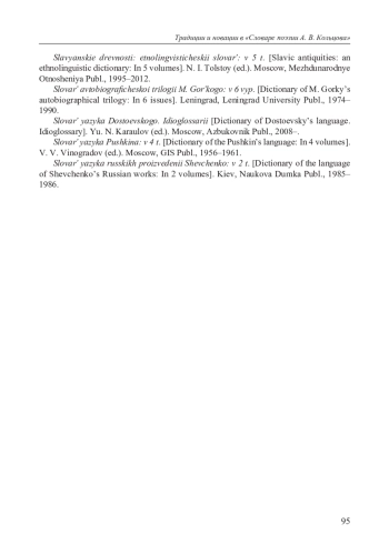 Попытки создания «Словаря поэзии А. В. Кольцова» (далее — СПОК) предпринимаются более 60 лет, однако эта работа до сих пор не была доведена до конца (см. [Кавецкая 1971; Кретов 2009; Чуриков 2008]). Авторы настоящей статьи создали новую концепцию СПОКа, который будет представлять собой своеобразный сплав традиционности и инновационности. Этот сплав обнаруживается в различных аспектах создания Словаря. Обратимся к спискам источников словаря, которые делятся на две группы: а) список использованных изданий текстов А. В. Кольцова; б) список использованных словарей