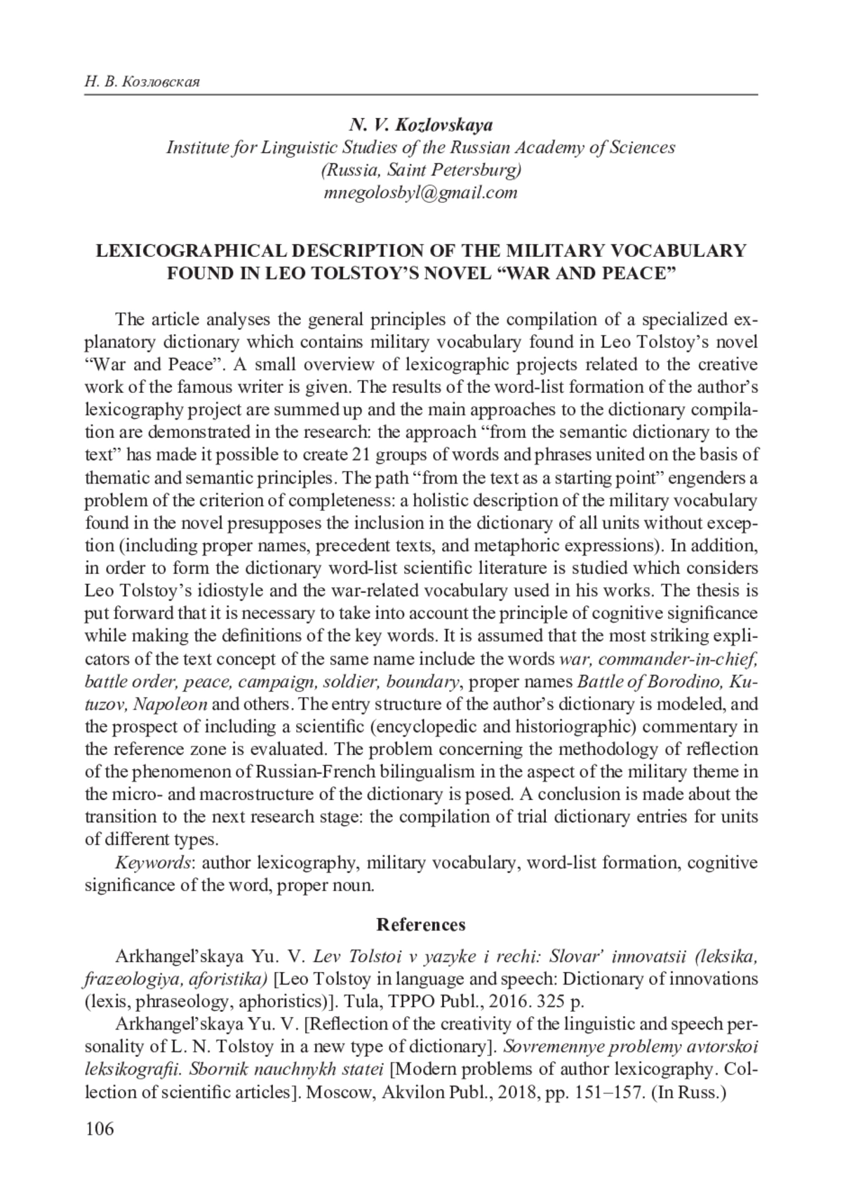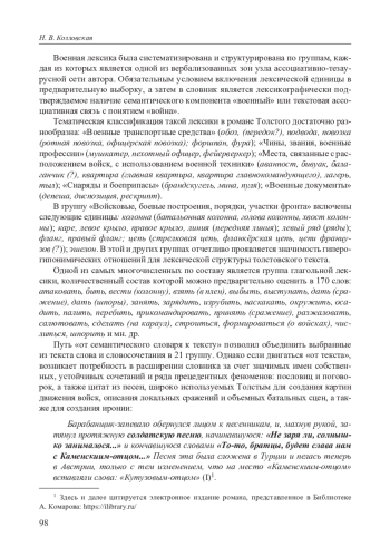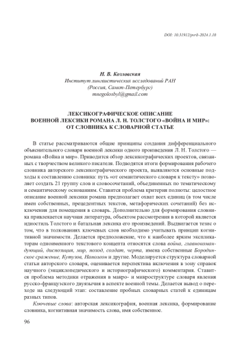 Статья посвящена проблеме лексикографического описания одной тематической области авторского лексикона Л. Н. Толстого: военной лексики романа-эпопеи «Война и мир». Несмотря на то, что язык Л. Н. Толстого является одним из традиционных объектов филологического анализа, а идиостиль писателя много раз становился объектом лингвистического анализа, целостное лексикографическое описание этого многомерного и сложного явления находится на начальной стадии. В 2016 г. вышла книга Ю. В. Архангельской «Лев Толстой в языке и речи: Словарь инноваций (лексика, фразеология, афористика)», в которой собраны и классифицированы все новообразования Л. Н. Толстого. По словам автора, «словарь с разных сторон демонстрирует инновационные возможности языковой личности Л. Н. Толстого» [Архангельская 2018: 151]. В этот же период О. В. Ломакина осуществила целостное описание толстовской фразеологии и разработала макроструктуру фразеологического словаря писателя. Исследование О. В. Ломакиной показало, что состав тезаурусообразующих фразеологических единиц в идиолекте Л. Н. Толстого с течением времени менялся; этот процесс отразил эволюцию толстовской философии, см.: [Ломакина 2014; 2016].