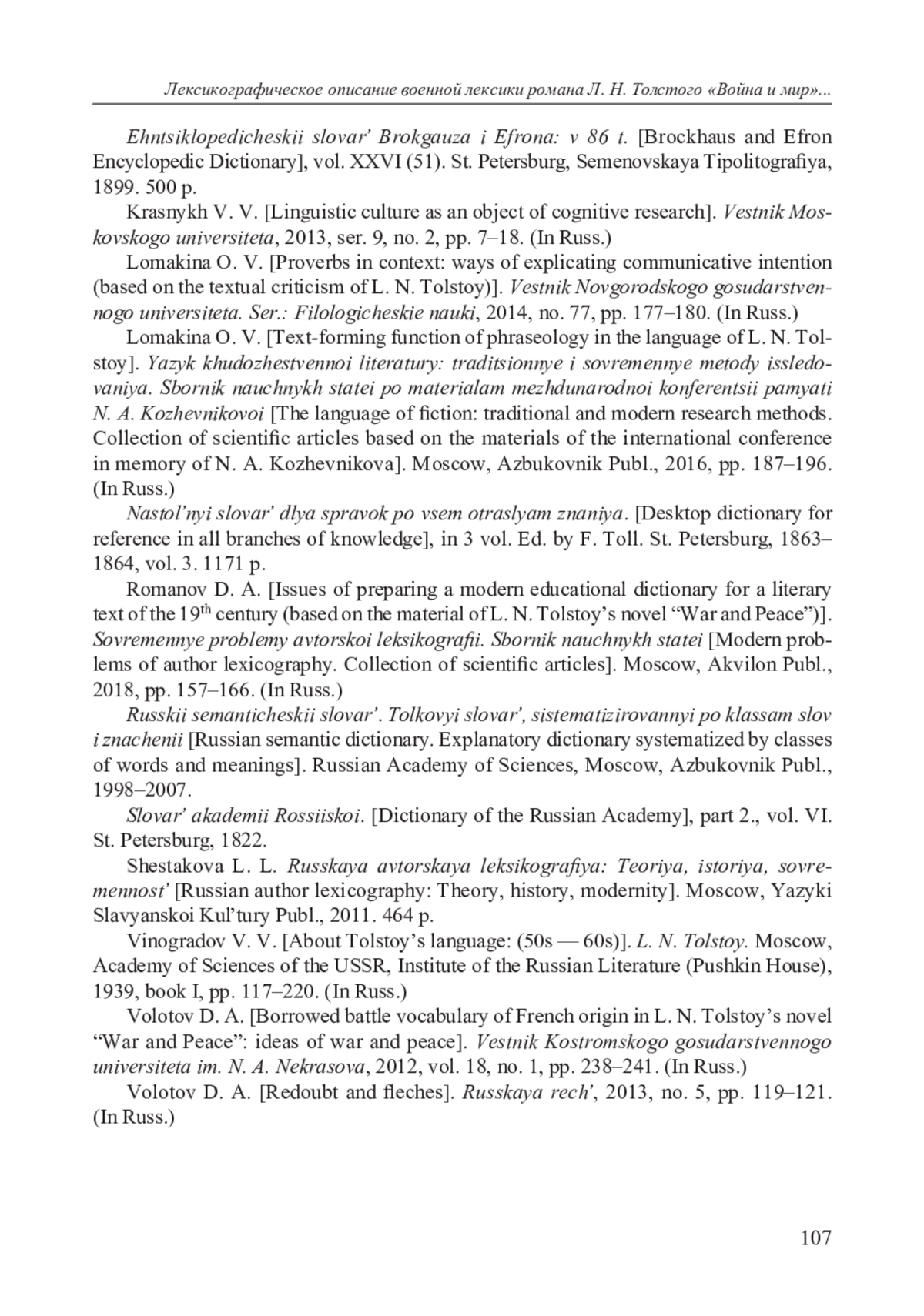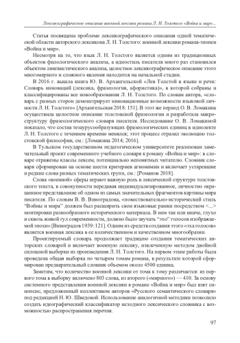 9. Романов Д. А. Вопросы подготовки современного учебного словаря к художественному тексту XIX века (на материале романа Л. Н. Толстого “Война и мир”) // Современные проблемы авторской лексикографии: Сборник научных статей. Под общ. ред. Л. Л. Шестаковой. М.: Аквилон, 2018. С. 157-166. EDN: YQNBIT