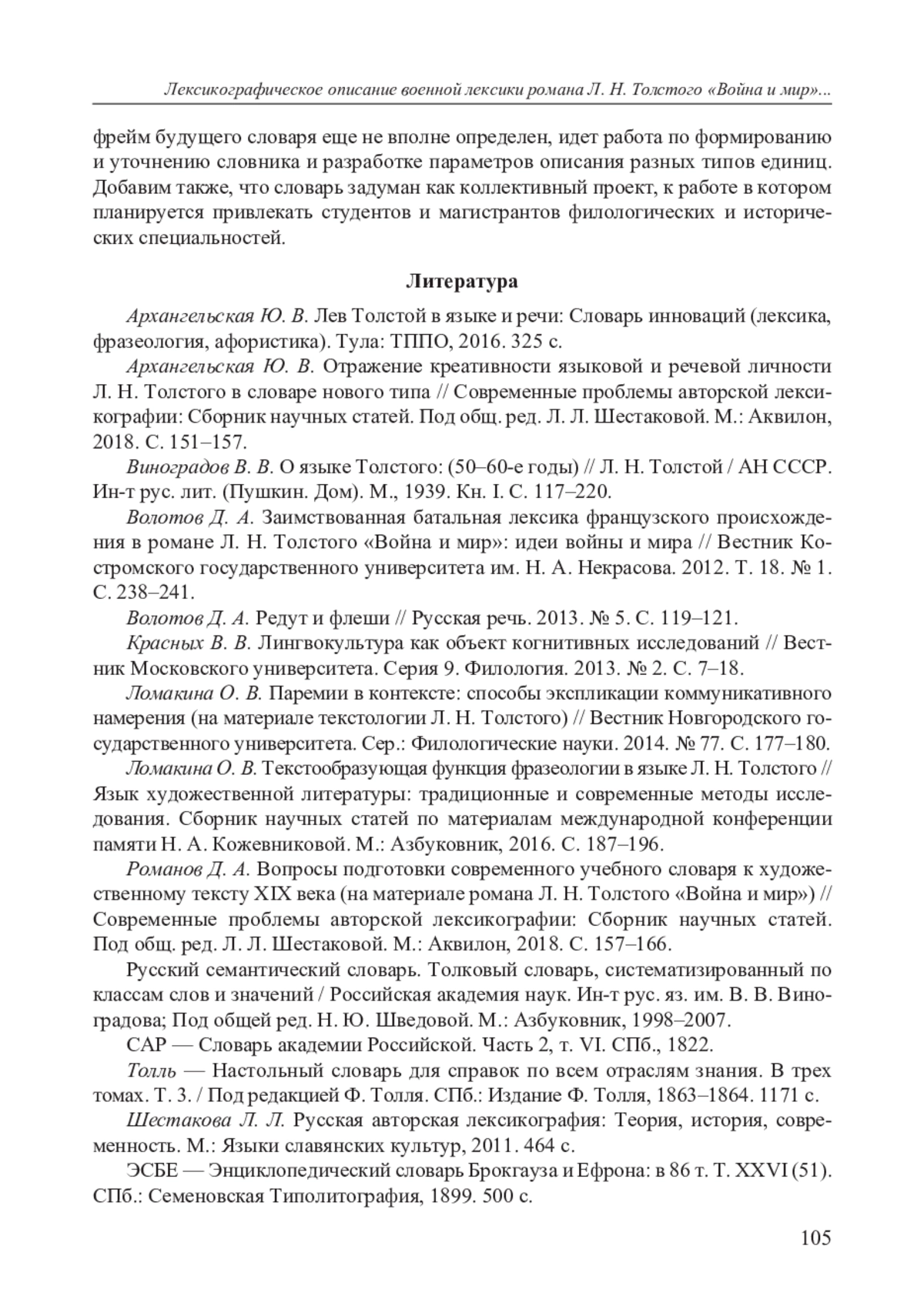 1. Архангельская Ю. В. Лев Толстой в языке и речи: Словарь инноваций (лексика, фразеология, афористика). Тула: ТППО, 2016. 325 с. EDN: YOXHZL