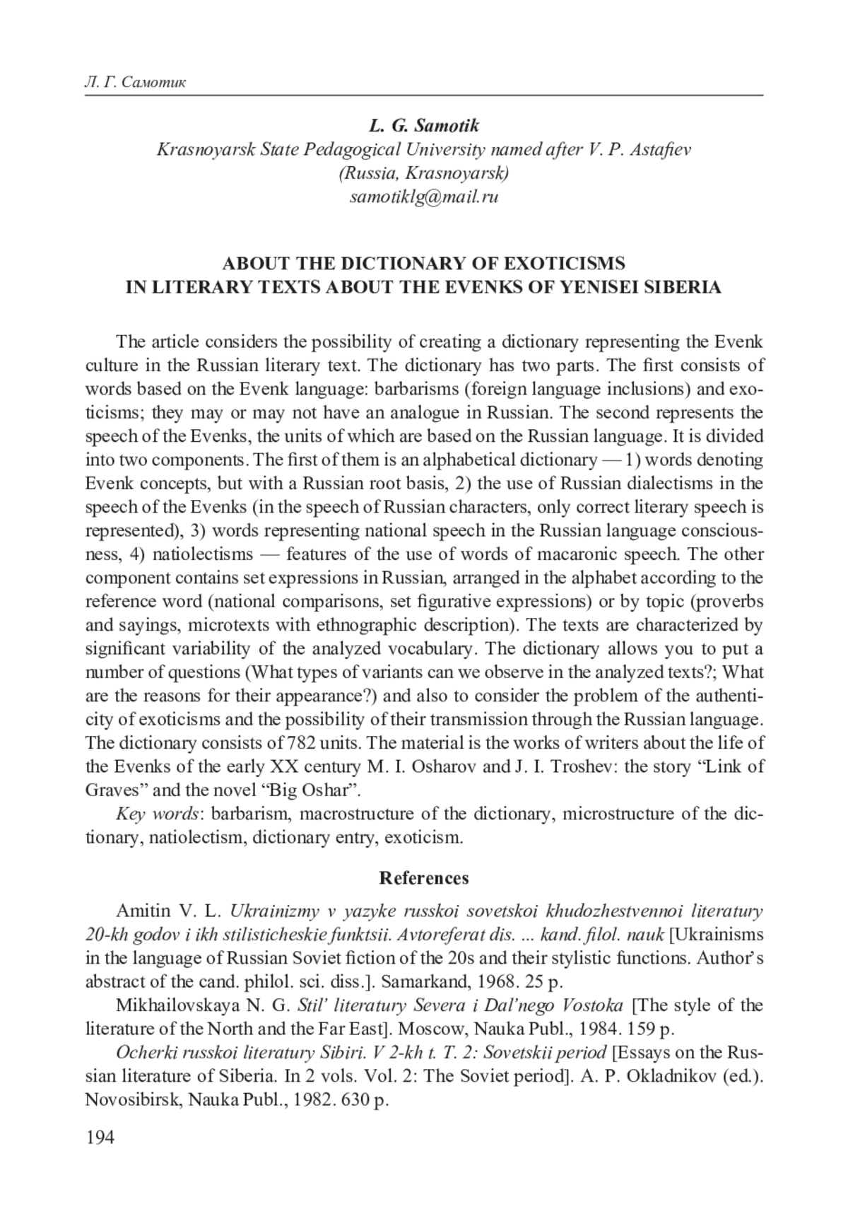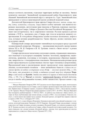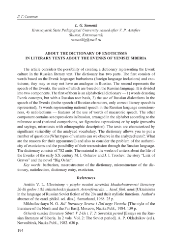 В статье рассматривается возможность создания словаря, представляющего эвенкийскую культуру в русском художественном тексте. Словарь состоит из двух частей. Первая — из слов, в основе которых лежит эвенкийский язык: варваризмы (иноязычные вкрапления) и экзотизмы, как имеющие аналог в русском языке, так и не имеющие его. Вторая представляет речь эвенков, в основе единиц которой положен русский язык. Она делится на две составляющие: словарь, построенный в алфавитном порядке — 1) слова, обозначающие эвенкийские понятия, но с русской корневой основой, 2) использование русских диалектизмов в речи эвенков (в речи русских персонажей представлена только правильная литературная речь), 3) слова, представляющие в русском языковом сознании национальную речь, 4) нациолектизмы — особенности употребления слов макаронической речи. Другая составляющая — устойчивые сочетания на русском языке, выстроенные в алфавите по опорному слову (национальные сравнения, устойчивые образные выражения) или по теме (пословицы и поговорки, микротексты с этнографическим описанием). Тексты отличаются значительной вариативностью анализируемой лексики. Словарь позволяет поставить ряд вопросов (какие виды вариантов мы можем наблюдать в анализируемых текстах? каковы причины их появления?), а также рассмотреть проблему достоверности экзотизмов и возможности их передачи через русский язык. Словник состоит из 782 единиц. Материал — произведения писателей о жизни эвенков начала XX в. М. И. Ошарова и Ж. И. Трошева: повесть «Звено могил» и роман «Большой Ошар».