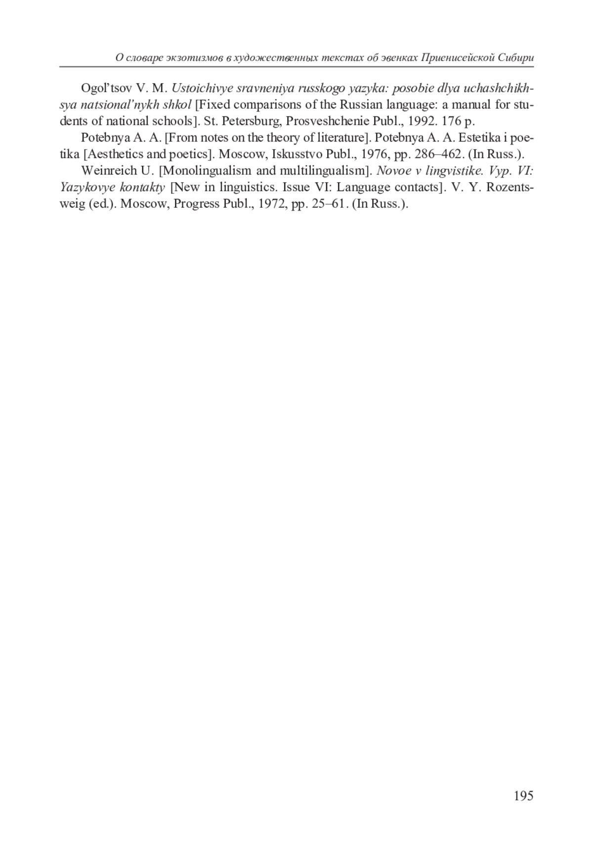 15. Вайнрайх У. Одноязычие и многоязычие // Новое в лингвистике. Вып. VI: Языковые контакты / отв. ред. В. Ю. Розенцвег. М.: Прогресс, 1972. С. 25-61.