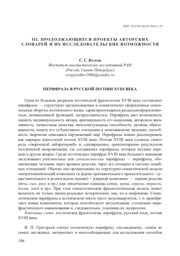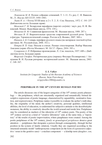 Один из больших разрядов поэтической фразеологии XVIII века составляют перифразы — структурно организованные и семантически оформленные описательные обороты поэтического языка, характеризующиеся раздельнооформленностью, номинативной функцией, экспрессивностью. Перифраза дает возможность оценить индивидуальность автора, оригинальность его мышления, авторскую креативность, личностные качества, интеллектуальные способности, уровень образованности, понять его субъективное отношение к описываемому явлению, способность творчески описывать окружающий мир. Перифразы можно рассматривать как маркеры идиостилей поэтов XVIII века. Поэзия XVIII века служила своего рода «творческой лабораторией» и, одновременно, «репозитарием» результатов поэтической импровизации, где создавались перифразы, которые позднее перешли в другие жанры. Среди поэтических перифраз XVIII века большого внимания заслуживают родственные или генеалогические перифразы — перифразы, обозначающие человека через кровное родство, через его позицию в системе семейных отношений. Обычно они организованы по структурно-семантической модели «антропонимический компонент (в форме притяжательного прилагательного / существительного в родительном падеже) + ядерный компонент — термин родства (дочь, сын, внук и пр.) или лексические единицы ветвь, кровь, корень, отрасль, племя, плод и пр». При этом генеалогическая фразеологическая модель может включать не только имена реальных исторических лиц, но и мифонимы. Генеалогические перифразы в поэтическом тексте часто эксплицируются, т. е. приобретают новые компоненты, которые способствуют актуализации, уточнению перифрастического наименования и, следовательно, усилению их экспрессии