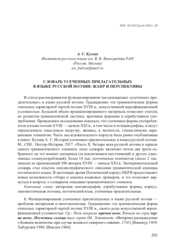 В статье рассматривается функционирование так называемых «усеченных прилагательных» в языке русской поэзии. Традиционно эти грамматические формы считались характерной чертой поэзии XVIII в., искусственной версификационной условностью. Большой объем проанализированного материала позволяет считать их реликтом грамматической системы: краткими формами в атрибутивном употреблении. Проведенное исследование показало, что усеченные формы употребляются в языке поэзии XVIII — начала XXI в., в том числе в позиции рифмы, и несут определенную смысловую нагрузку, являясь, в частности, стилистически окрашенным элементом. Часть исследовательского корпуса была ранее опубликована в книге: Кулева А. С. История усеченных прилагательных в языке русской поэзии. М.; СПб.: Нестор-История, 2017. «Часть II. Четыре века русской поэзии в зеркале одного грамматического элемента: опыт словаря» включает почти две трети собранного на тот момент материала (за исключением местоимений и других однотипных словоупотреблений): более 10 тыс. поэтических контекстов (около 2 тыс. лексем) из произведений 500 авторов XVIII — начала XXI в. Экспериментальный словарь стал опытом лексикографического описания грамматической единицы поэтического языка. В настоящее время Поэтический корпус НКРЯ предоставляет новые возможности отбора и анализа языковых примеров, и это позволяет вернуться к вопросу о словарном описании грамматического элемента.