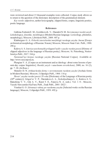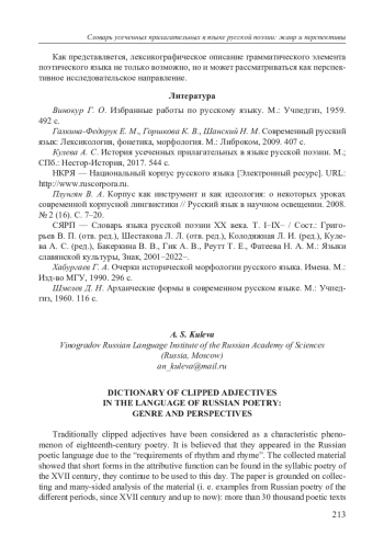 3. Кулева А. С. История усеченных прилагательных в языке русской поэзии. М.; СПб.: Нестор-История, 2017. 544 с. EDN: ZUDSZX