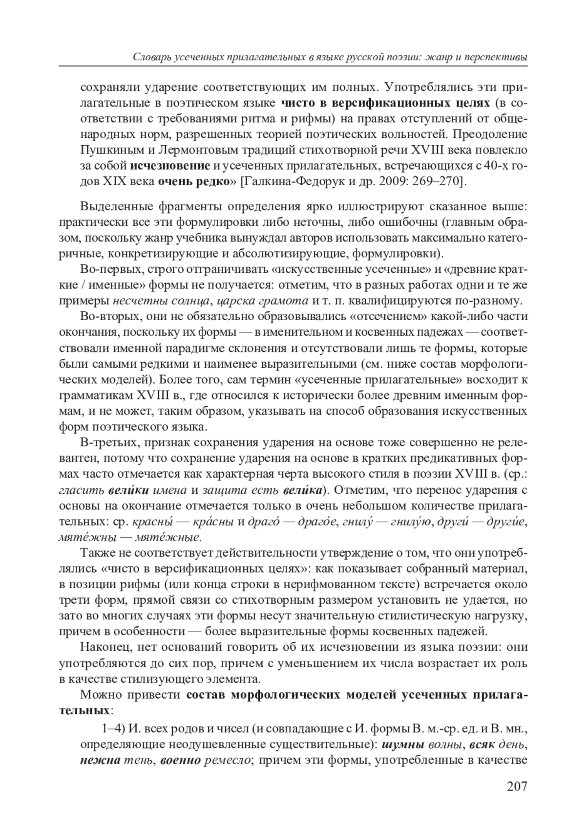 1. Функционирование усеченных прилагательных в языке русской поэзии — проблема интересная и многоаспектная. Традиционно эта грамматическая форма считалась характерной чертой поэзии XVIII в., своего рода искусственной версификационной условностью. Ср.: Поля покрыла мрачна ночь; Взошла на горы черна тень; Несчетны солнца там горят (М. Ломоносов. «Вечернее размышление о Божием величестве при случае великого северного сияния», 1743) [Винокур 1959; Хабургаев 1990; Шмелев 1960].