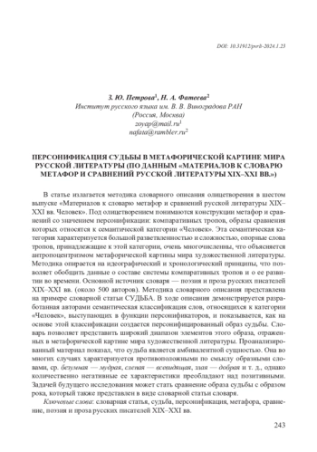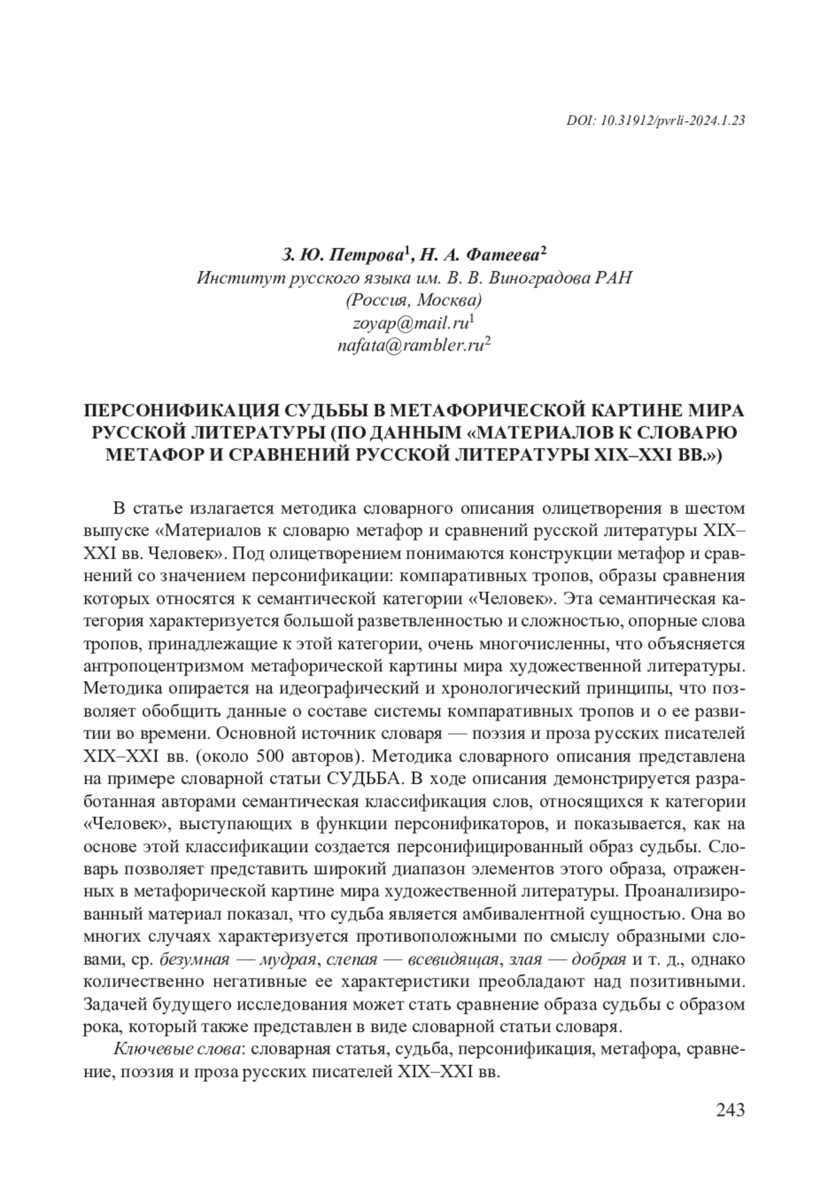 В статье излагается методика словарного описания олицетворения в шестом выпуске «Материалов к словарю метафор и сравнений русской литературы XIX– XXI вв. Человек». Под олицетворением понимаются конструкции метафор и сравнений со значением персонификации: компаративных тропов, образы сравнения которых относятся к семантической категории «Человек». Эта семантическая категория характеризуется большой разветвленностью и сложностью, опорные слова тропов, принадлежащие к этой категории, очень многочисленны, что объясняется антропоцентризмом метафорической картины мира художественной литературы. Методика опирается на идеографический и хронологический принципы, что позволяет обобщить данные о составе системы компаративных тропов и о ее развитии во времени. Основной источник словаря — поэзия и проза русских писателей XIX–XXI вв. (около 500 авторов). Методика словарного описания представлена на примере словарной статьи СУДЬБА. В ходе описания демонстрируется разработанная авторами семантическая классификация слов, относящихся к категории «Человек», выступающих в функции персонификаторов, и показывается, как на о снове этой классификации создается персонифицированный образ судьбы. Словарь позволяет представить широкий диапазон элементов этого образа, отраженных в метафорической картине мира художественной литературы. Проанализированный материал показал, что судьба является амбивалентной сущностью. Она во многих случаях характеризуется противоположными по смыслу образными словами, ср. безумная — мудрая, слепая — всевидящая, злая — добрая и т. д., однако количественно негативные ее характеристики преобладают над позитивными. Задачей будущего исследования может стать сравнение образа судьбы с образом рока, который также представлен в виде словарной статьи словаря