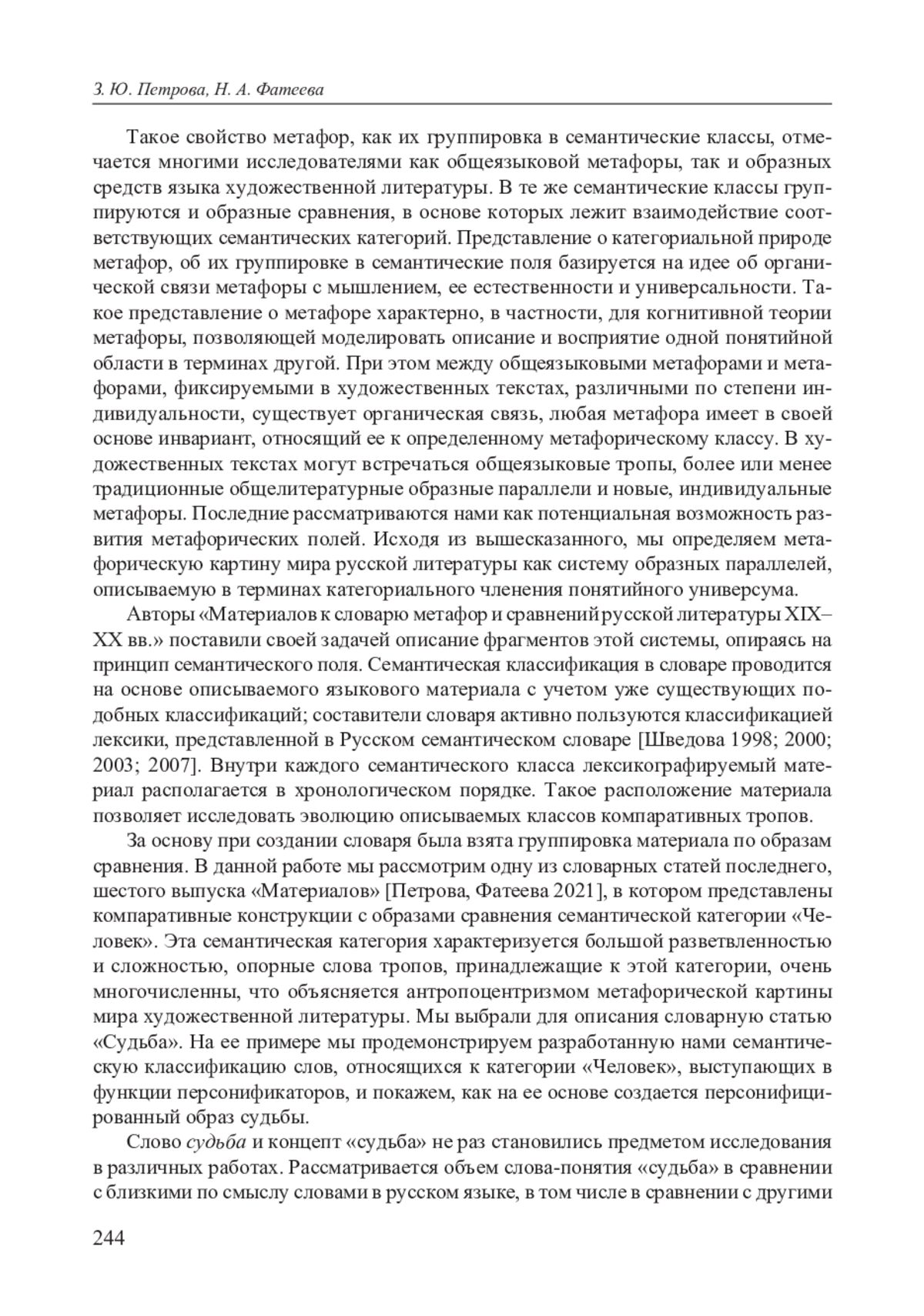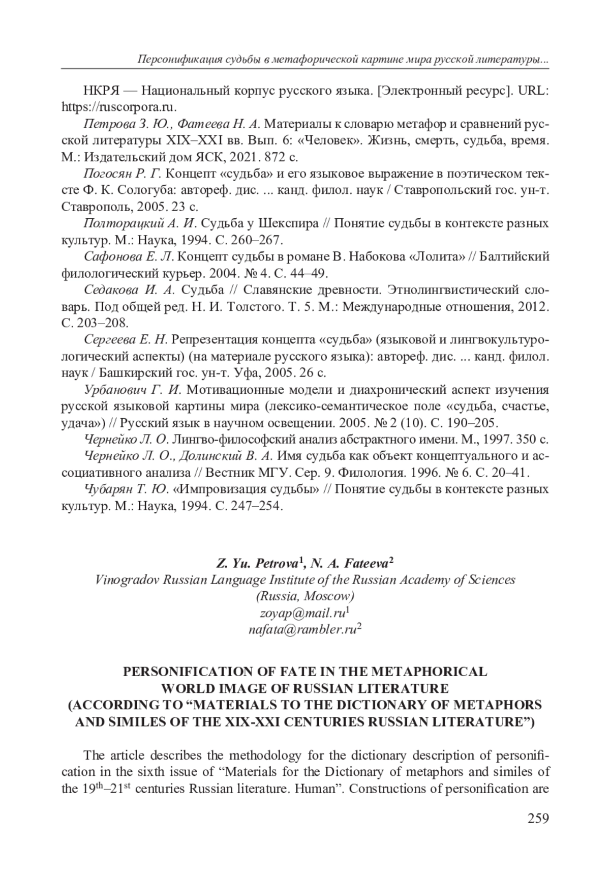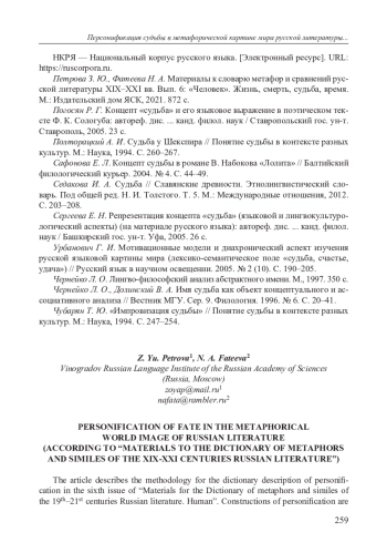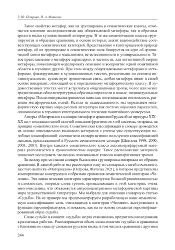10. Петрова З. Ю., Фатеева Н. А. Материалы к словарю метафор и сравнений русской литературы XIX-XXI вв. Вып. 6: “Человек”. Жизнь, смерть, судьба, время. М.: Издательский дом ЯСК, 2021. 872 с.