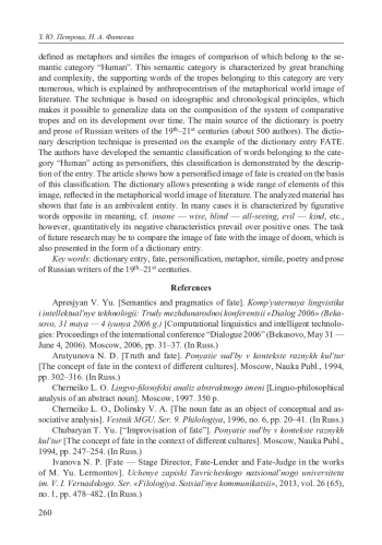1. Апресян В. Ю. Семантика и прагматика судьбы // Компьютерная лингвистика и интеллектуальные технологии: Труды международной конференции “Диалог 2006” (Бекасово, 31 мая - 4 июня 2006 г.) / Под ред. Н. И. Лауфер, А. С. Нариньяни, В. П. Селегея. М.: Изд-во РГГУ, 2006. С. 31-37. EDN: PXCWHZ