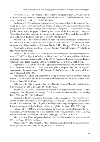 6. Ковшова М. Л. Концепт судьбы. Фольклор и фразеология // Понятие судьбы в контексте разных культур. М.: Наука, 1994. С. 137-147. EDN: YYDHQI
