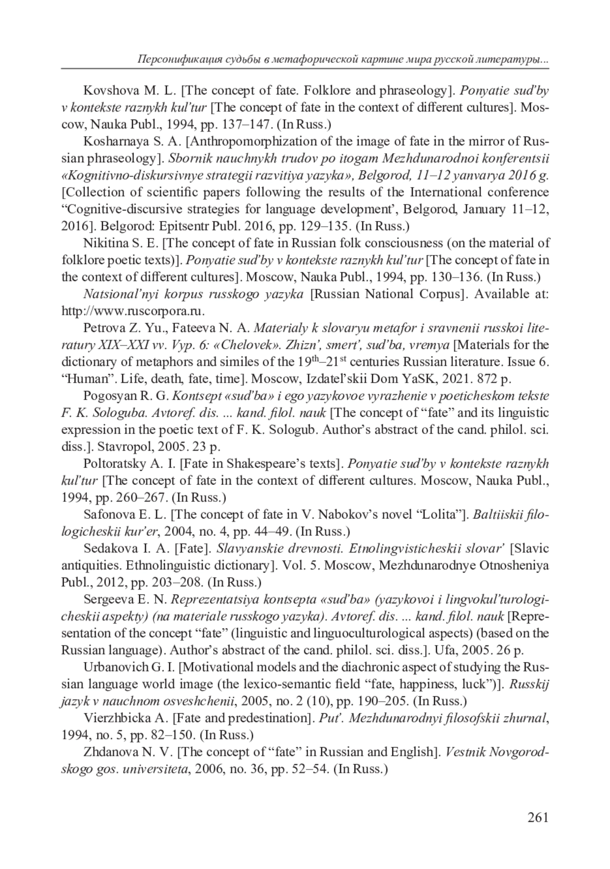 8. Никитина С. Е. Концепт судьбы в русском народном сознании (на материале устнопоэтических текстов) // Понятие судьбы в контексте разных культур. М.: Наука, 1994. С. 130-136.