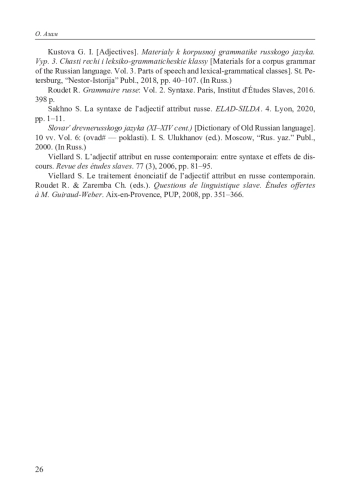 8. Sakhno S. La syntaxe de l’adjectif attribut russe // ELAD-SILDA. 4. Lyon, 2020. P. 1-11.