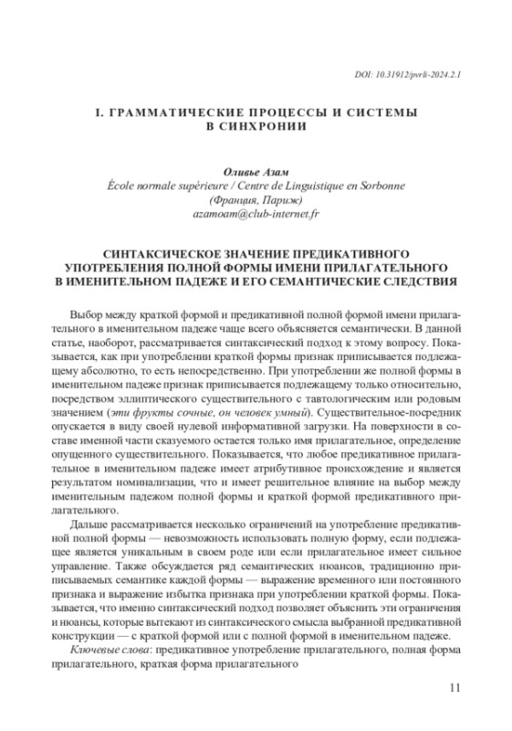 Выбор между краткой формой и предикативной полной формой имени прилагательного в именительном падеже чаще всего объясняется семантически. В данной статье, наоборот, рассматривается синтаксический подход к этому вопросу. Показывается, как при употреблении краткой формы признак приписывается подлежащему абсолютно, то есть непосредственно. При употреблении же полной формы в именительном падеже признак приписывается подлежащему только относительно, посредством эллиптического существительного с тавтологическим или родовым значением (эти фрукты сочные, он человек умный). Существительное-посредник опускается в виду своей нулевой информативной загрузки. На поверхности в составе именной части сказуемого остается только имя прилагательное, определение опущенного существительного. Показывается, что любое предикативное прилагательное в именительном падеже имеет атрибутивное происхождение и является результатом номинализации, что и имеет решительное влияние на выбор между именительным падежом полной формы и краткой формой предикативного прилагательного. Дальше рассматривается несколько ограничений на употребление предикативной полной формы — невозможность использовать полную форму, если подлежащее является уникальным в своем роде или если прилагательное имеет сильное управление. Также обсуждается ряд семантических нюансов, традиционно приписываемых семантике каждой формы — выражение временного или постоянного признака и выражение избытка признака при употреблении краткой формы. Показывается, что именно синтаксический подход позволяет объяснить эти ограничения и нюансы, которые вытекают из синтаксического смысла выбранной предикативной конструкции — с краткой формой или с полной формой в именительном падеже.
