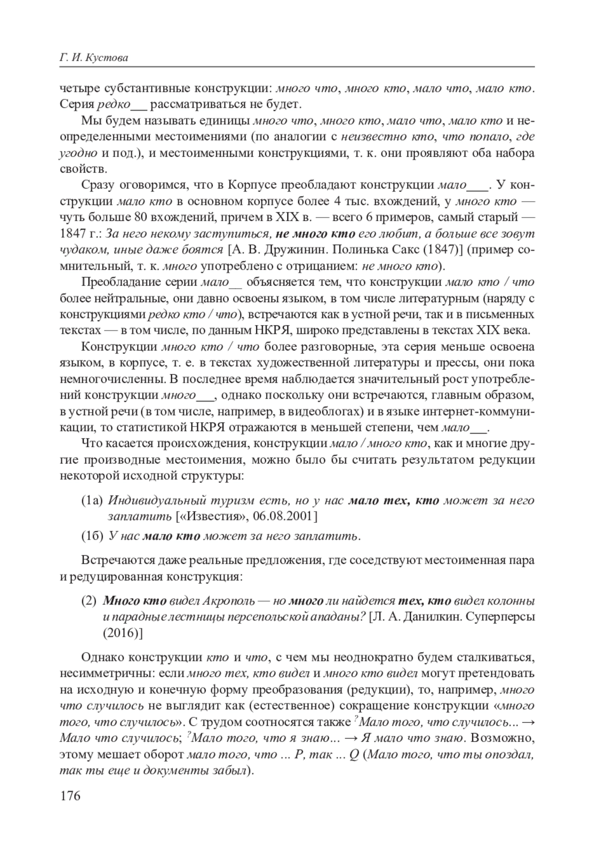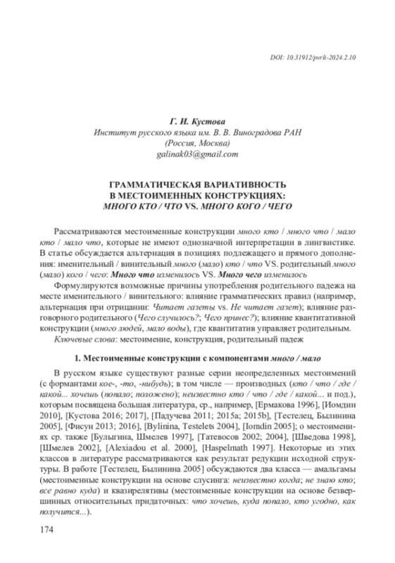Рассматриваются местоименные конструкции много кто / много что / мало кто / мало что, которые не имеют однозначной интерпретации в лингвистике. В статье обсуждается альтернация в позициях подлежащего и прямого дополнения: именительный / винительный много (мало) кто / что VS. родительный много (мало) кого / чего: Много что изменилось VS. Много чего изменилось Формулируются возможные причины употребления родительного падежа на месте именительного / винительного: влияние грамматических правил (например, альтернация при отрицании: Читает газеты vs. Не читает газет); влияние разговорного родительного (Чего случилось?; Чего принес?); влияние квантитативной конструкции (много людей, мало воды), где квантитатив управляет родительным.