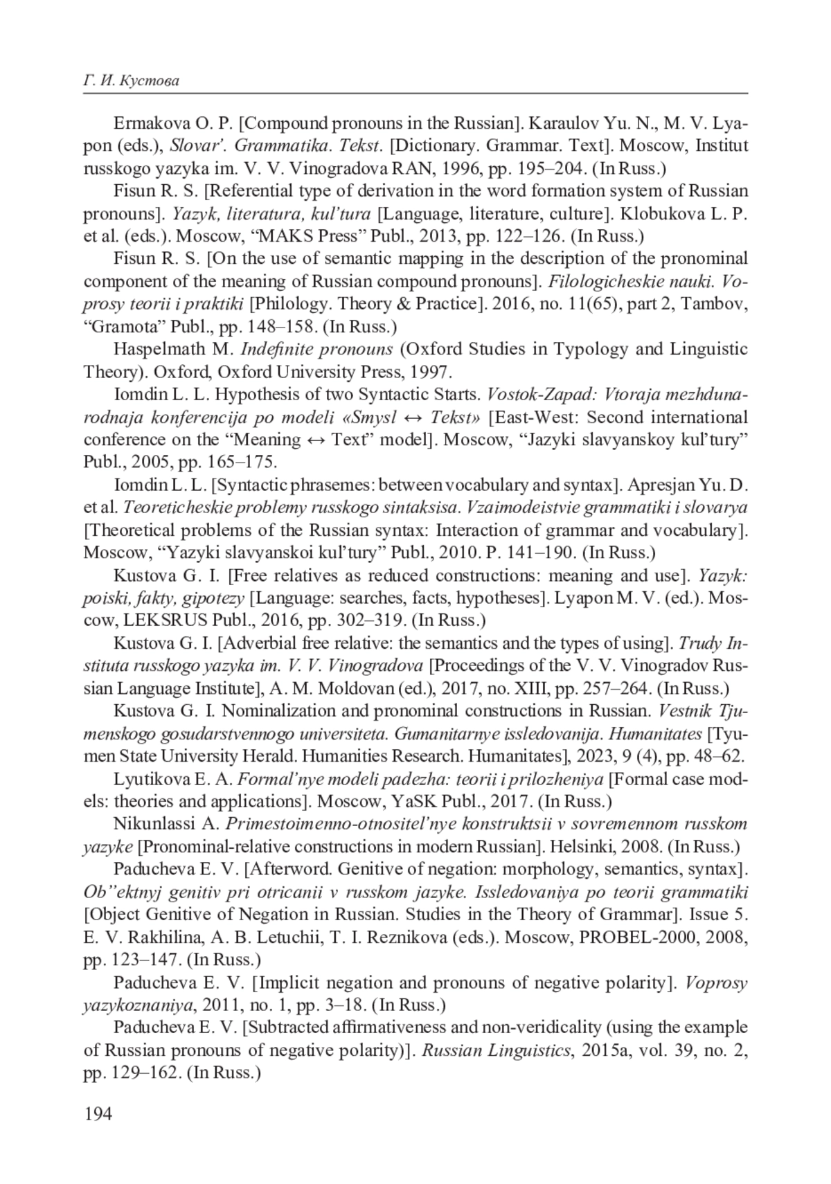 5. Кустова Г. И. Свободные релятивы как редуцированные конструкции: значение и употребление // Язык: поиски, факты, гипотезы. К 100-летию со дня рождения академика Н. Ю. Шведовой / Отв. ред. д.ф.н. М.В. Ляпон. М.: ЛЕКСРУС, 2016. С. 302-319. EDN: YFHHBZ