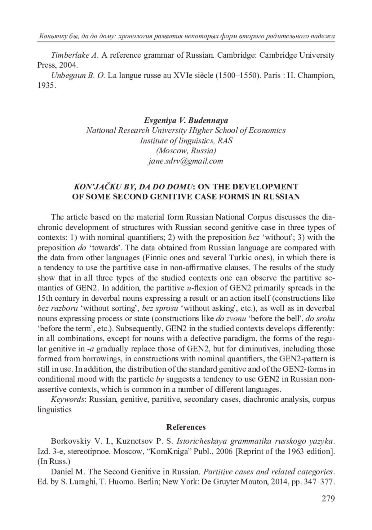 В статье на материале Национального корпуса русского языка (НКРЯ) исследуется диахроническое развитие конструкций со вторым родительным падежом (флексия -у) в трех типах контекстов: 1) конструкции с именными квантификаторами; 2) конструкции с предлогом без; 3) конструкции с предлогом до. Также данные русского языка сравниваются с данными других языков (прибалтийско-финских, некоторых тюркских), в которых присутствует тенденция к употреблению партитивного падежа в неутвердительных высказываниях. Результаты исследования показывают, что во всех трех типах исследуемых контекстов имеются основания выделять партитивную семантику GEN2. Кроме того, у-флексия GEN2, не восходящая к историческому ŭ-склонению и некоторым односложным словам исторического ŏ-склонения, в первую очередь распространяется в XV в. у отглагольных существительных с семантикой результата или собственно акта действия (конструкции вида без спросу, без разбору и т. д.), а также у отглагольных существительных с абстрактной семантикой процесса или состояния (конструкции вида до звону, до сроку и т. д.). В дальнейшем развитие GEN2 в исследуемых контекстах происходит по-разному: во всех исследуемых сочетаниях, за исключением существительных с дефектной парадигмой, формы регулярного генитива на -а постепенно вытесняют формы GEN2, однако для диминутивов, в том числе образованных от заимствований, в конструкциях с квантификаторами модель с GEN2 по-прежнему употребительна. Кроме того, дистрибуция некоторых существительных в формах регулярного генитива и GEN2 в конструкциях с бы со значением пожелания позволяет сделать вывод о том, что в русском языке присутствует тенденция к употреблению GEN2 в неассертивных контекстах, характерная для ряда других языков