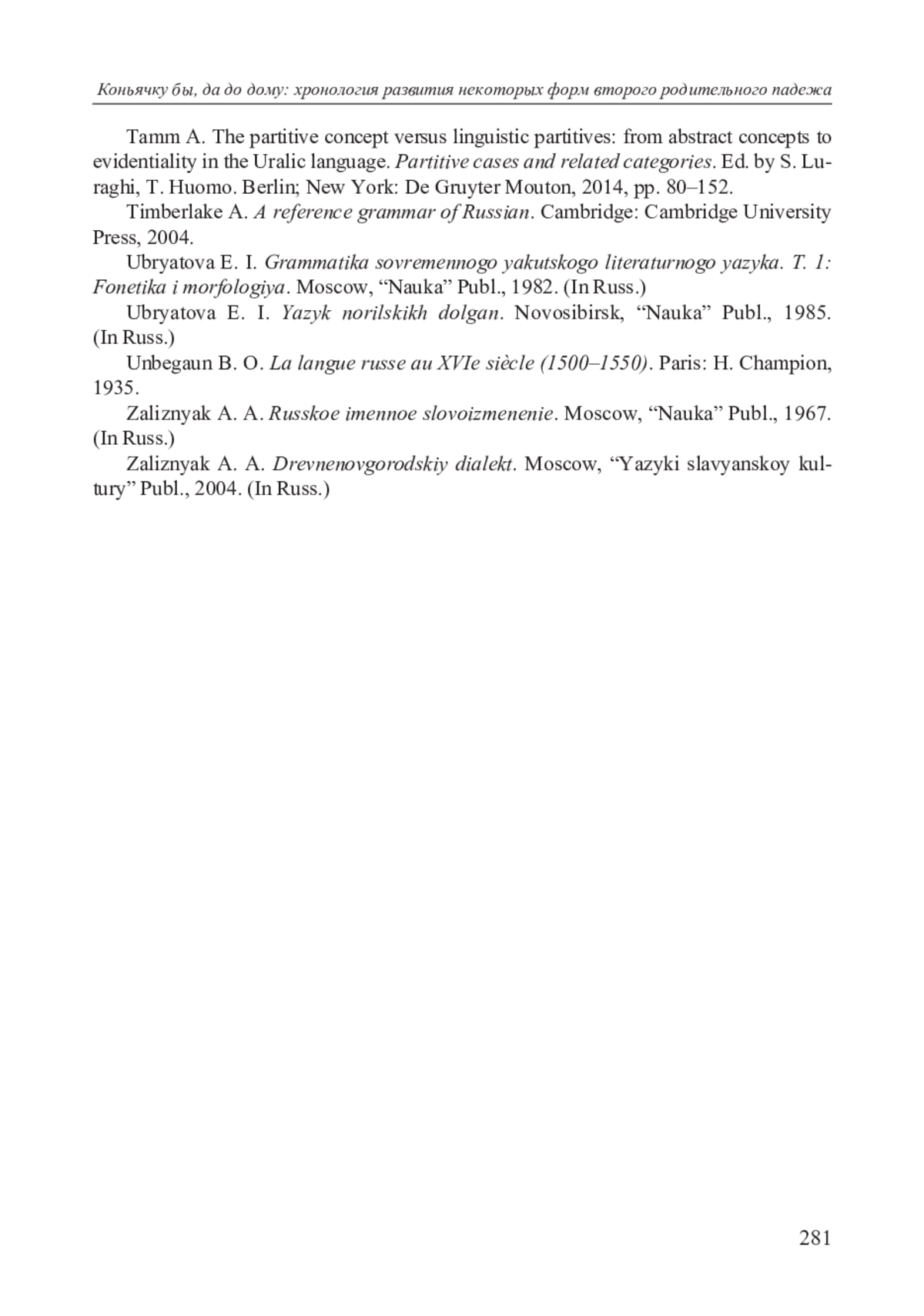 34. Tamm A. The partitive concept versus linguistic partitives: from abstract concepts to evidentiality in the Uralic language // Partitive cases and related categories. Ed. by S. Luraghi, T. Huomo. Berlin; New York: De Gruyter Mouton, 2014. P. 80-152.