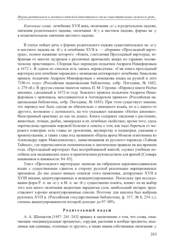 Предметом рассмотрения в данной статье стали формы родительного и местного падежей существительных мужского рода в лечебнике под названием «Книга, глаголемая Прохладный вертоград, избранная от многих мудрецов о различных врачевских вещех ко здравию человеческому пристоящих», переведенном с неустановленного языка подьячим Андреем Никифоровым в 1672 году. Был исследован список Российской государственной библиотеки, ф. 317, No 8. XVII в., имеющий высокий процент акцентуированности. Оказалось, что в родительном падеже распределение окончаний -а и -у в ряде случаев зависит от падежного значения: окончание -а употребляется в родительном принадлежности и счетной форме; окончание -у — в родительном времени и партитиве. В значении родительного субъекта, объекта, сравнения, изъяснения, в исходном и достигательном падежах окончание -а преобладает над окончанием -у, тогда как в родительном со значением причины, а также выделительной характеристики по материалу или веществу и в потенсиве (его значение — предотвращение потенциальной угрозы) существительные оканчиваются преимущественно на -у. Зависимость в присоединении окончания -a или -у от акцентной парадигмы обнаруживается только в трех значениях родительного падежа: исходном, достигательном и причинном. Здесь слова а. п. а и а. п. b имеют преимущественно флексию -а, а слова а. п. с — преимущественно флексию -у. Что касается местного падежа, то в Лечебнике представляет интерес достаточно большое количество нетривиальных случаев употребления существительных мужского рода в изъяснительном значении с предлогом о и окончанием -у (например, о насмо́рку, о хрѣну̀, о́ духу). Сравнение с деловой письменностью XVII в. показывает, что это явление встречается там лишь спорадически и только в формульных контекстах.