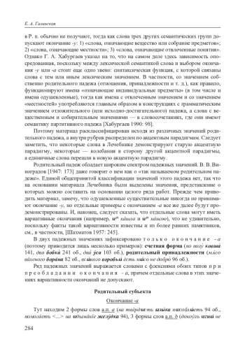 В Харьковской кормчей XV — XVI вв. имеются многочисленные формы родительного падежа отглагольных существительных, совпадающие с формой винительного падежа (Р=В): безъ ѡб̾щенїє, ѿ своєго имѣньє, цѣнѹ избавленьє. Такие формы с -е вместо -а отражают фонетическое явление — |е| на месте |а|, точнее, |а| → |е| в конечном открытом слоге после |j|. Оба писца Харьковской кормчей используют Р=В отглагольных существительных наравне с обычной формой родительного падежа. Поэтому можно считать, что фонетическое явление закрепилось в определенной грамматической форме существительных одного класса, Р = В таких слов стал для писцов вторым вариантом и вошел в узус. Р = В отглагольных существительных встречается в других рукописях XII–XVII вв.; обычно таких словоформ мало, и они являются лишь отражением |е| на месте |а|. Исключением являются псковские памятники XV в., описанные Н. М. Каринским. Харьковская кормчая также была написана на западе восточнославянской территории; в ру кописи имеются многочисленные западные диалектные особенности. Таким образом, Р = В отглагольных существительных преимущественно встречается в книжных письменных источниках западного и северо-западного происхождения