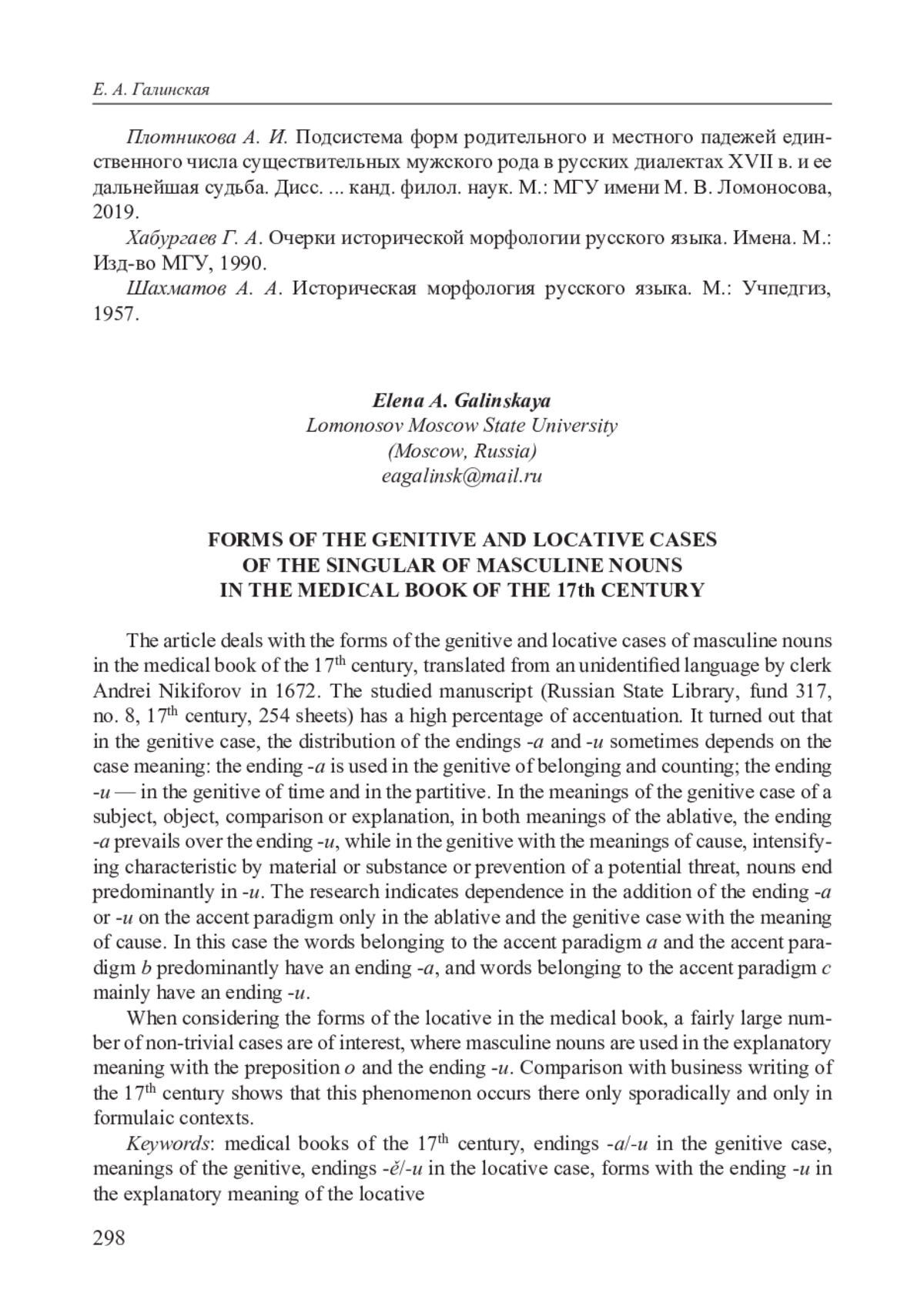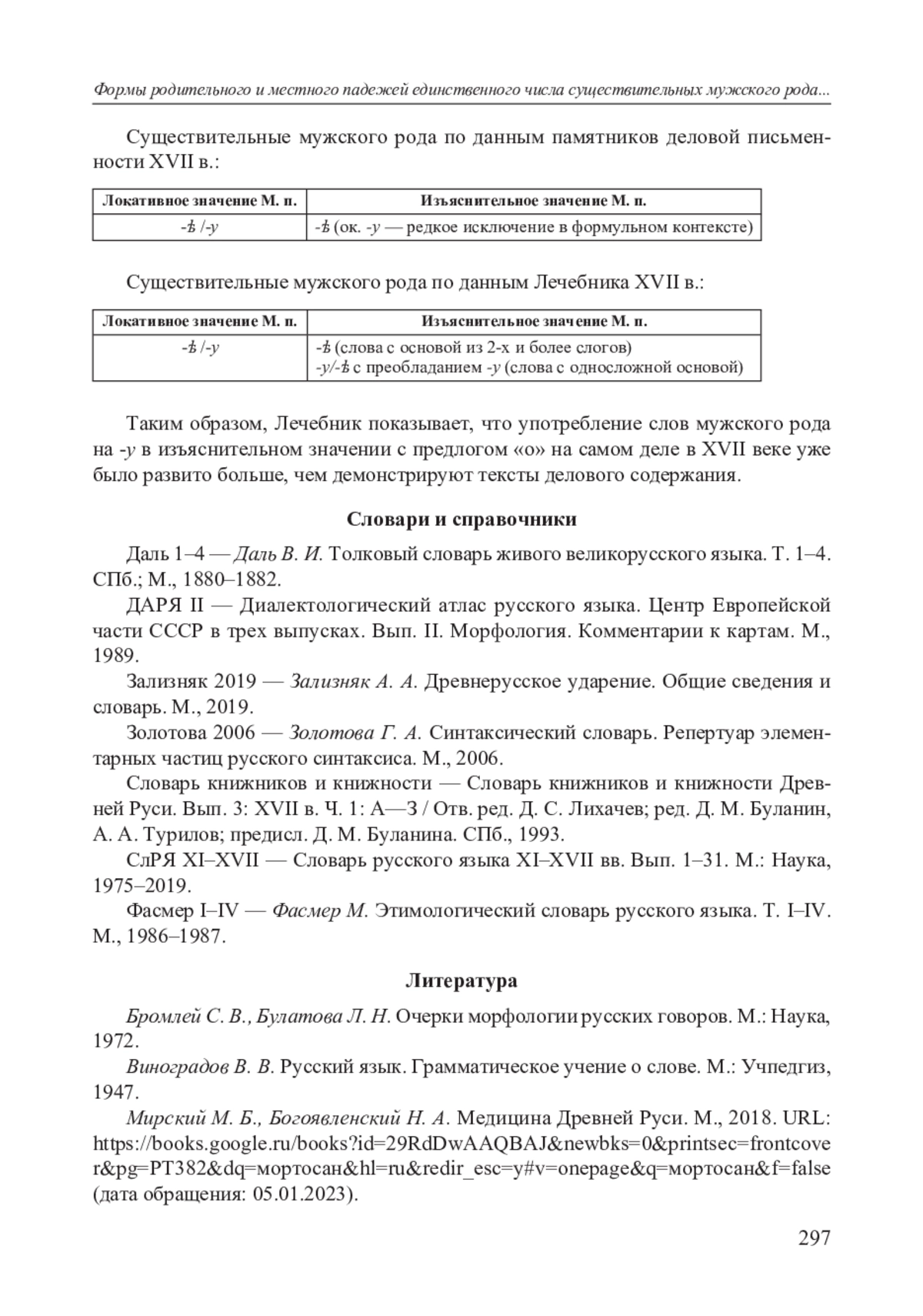 11. Плотникова А. И. Подсистема форм родительного и местного падежей единственного числа существительных мужского рода в русских диалектах XVII в. и ее дальнейшая судьба. Дисс. … канд. филол. наук. М.: МГУ имени М.В. Ломоносова, 2019. EDN: MVSFQN