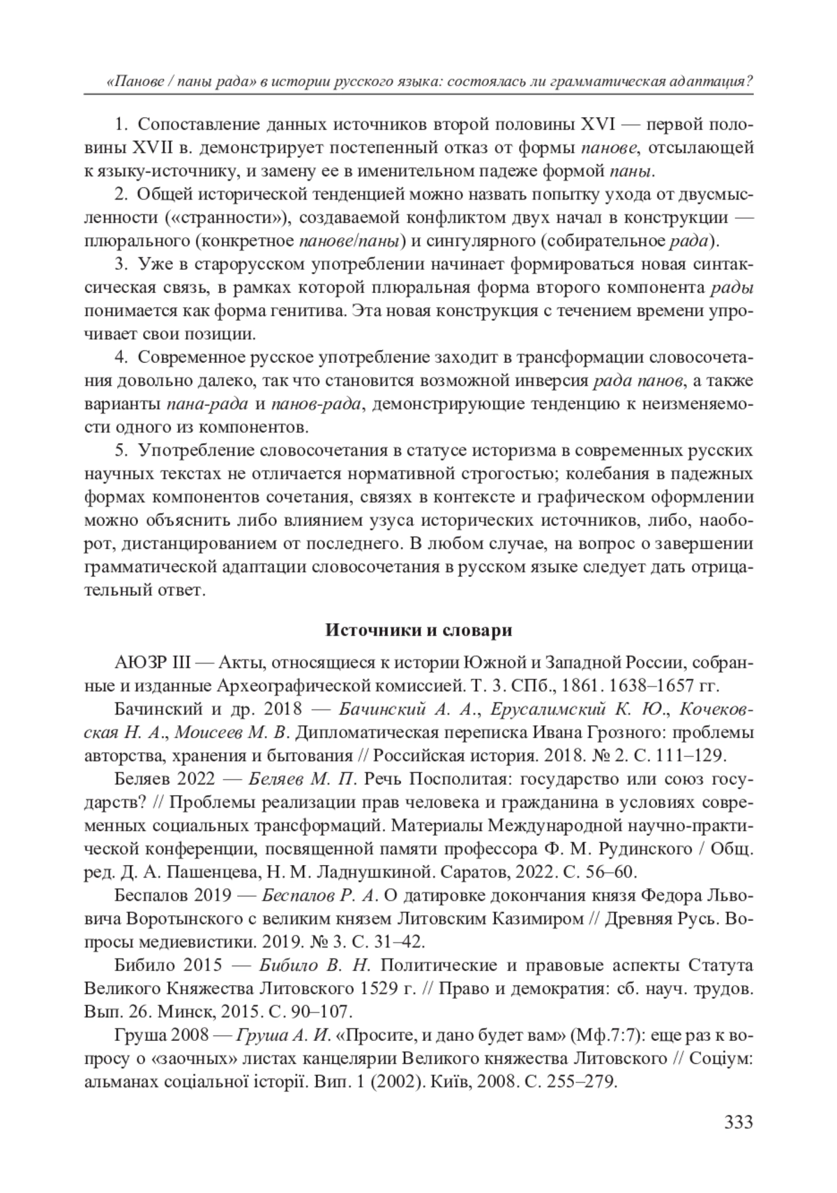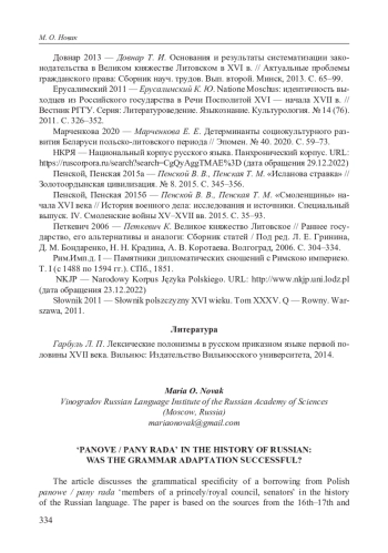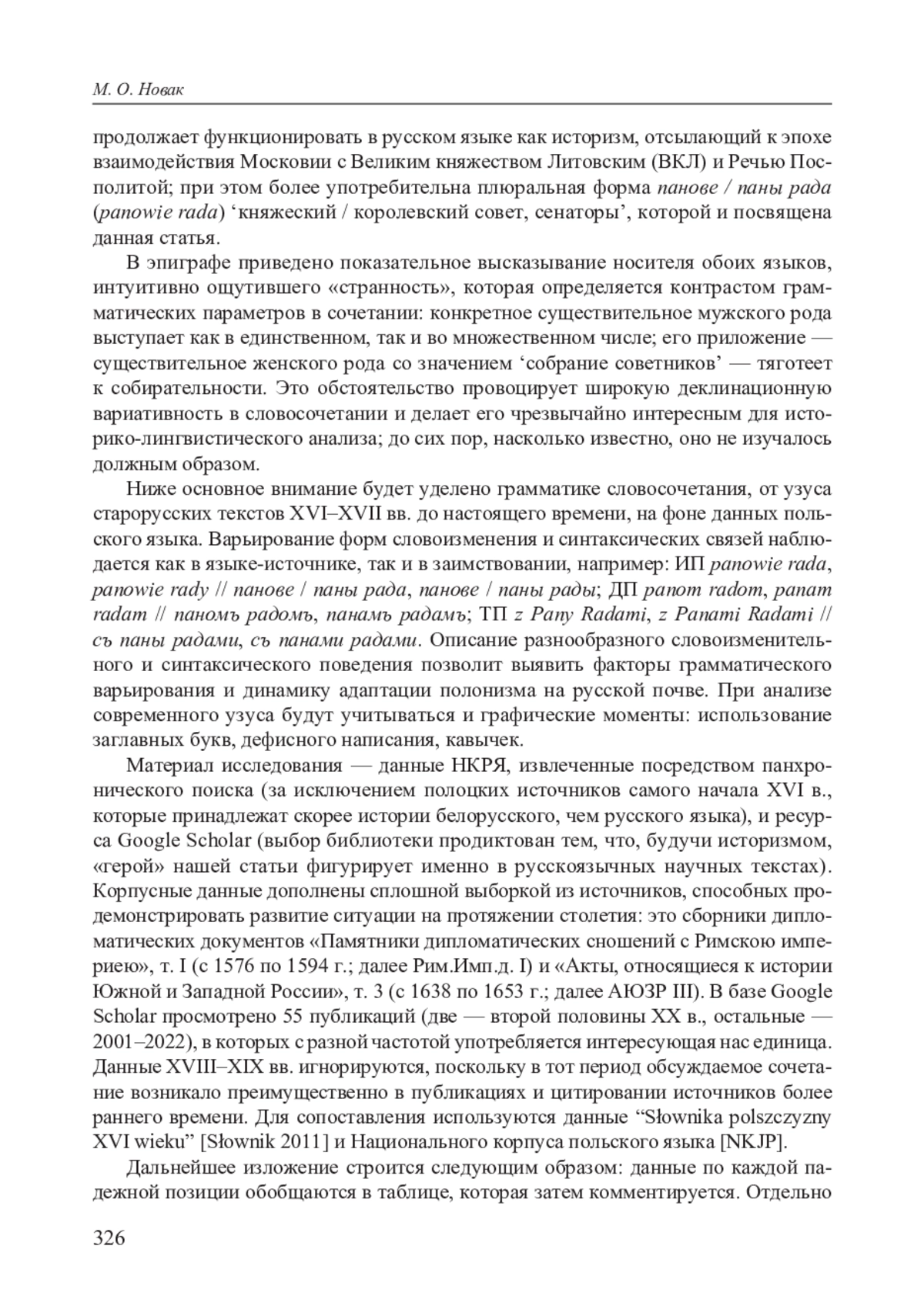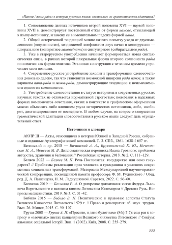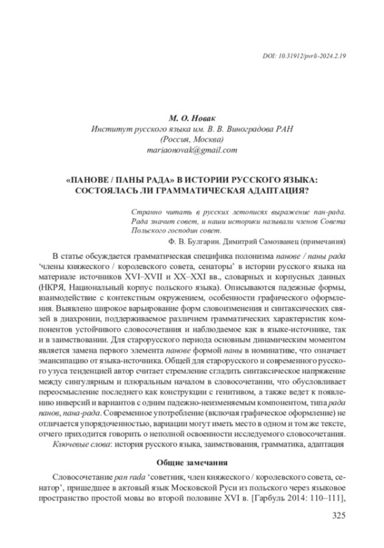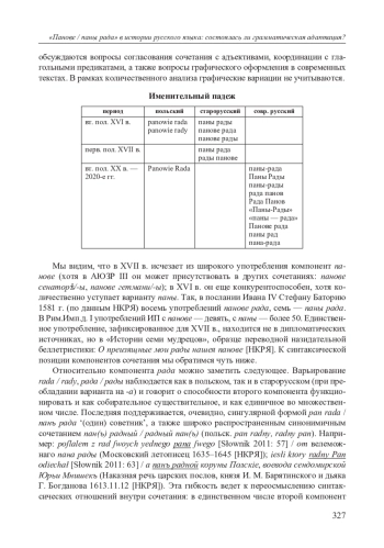 Словосочетание pan rada ‘советник, член княжеского / королевского совета, сенатор’, пришедшее в актовый язык Московской Руси из польского через языковое пространство простой мовы во второй половине XVI в. [Гарбуль 2014: 110–111], 326 продолжает функционировать в русском языке как историзм, отсылающий к эпохе взаимодействия Московии с Великим княжеством Литовским (ВКЛ) и Речью Посполитой; при этом более употребительна плюральная форма панове / паны рада (panowie rada) ‘княжеский / королевский совет, сенаторы’, которой и посвящена данная статья.