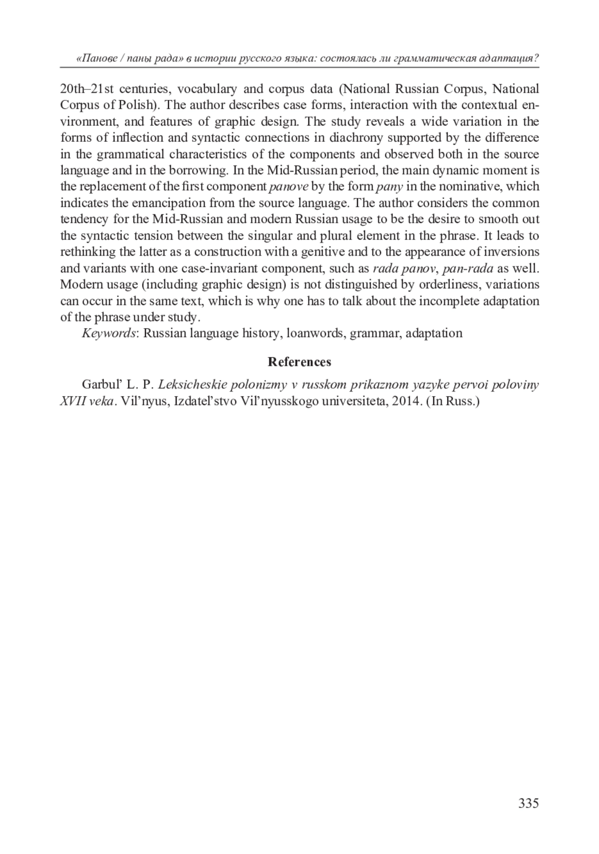 В статье обсуждается грамматическая специфика полонизма панове / паны рада ‘члены княжеского / королевского совета, сенаторы’ в истории русского языка на материале источников XVI–XVII и XX–XXI вв., словарных и корпусных данных (НКРЯ, Национальный корпус польского языка). Описываются падежные формы, взаимодействие с контекстным окружением, особенности графического оформления. Выявлено широкое варьирование форм словоизменения и синтаксических связей в диахронии, поддерживаемое различием грамматических характеристик компонентов устойчивого словосочетания и наблюдаемое как в языке-источнике, так и в заимствовании. Для старорусского периода основным динамическим моментом является замена первого элемента панове формой паны в номинативе, что означает эмансипацию от языка-источника. Общей для старорусского и современного русского узуса тенденцией автор считает стремление сгладить синтаксическое напряжение между сингулярным и плюральным началом в словосочетании, что обусловливает переосмысление последнего как конструкции с генитивом, а также ведет к появлению инверсий и вариантов с одним падежно-неизменяемым компонентом, типа рада панов, пана-рада. Современное употребление (включая графическое оформление) не отличается упорядоченностью, вариации могут иметь место в одном и том же тексте, отчего приходится говорить о неполной освоенности исследуемого словосочетания.