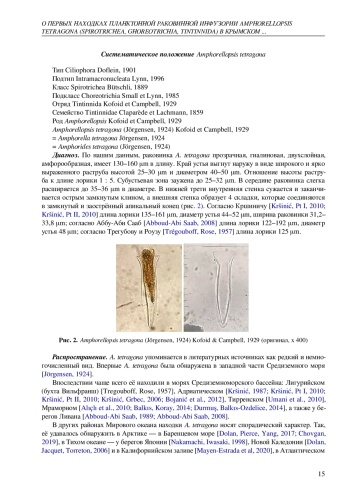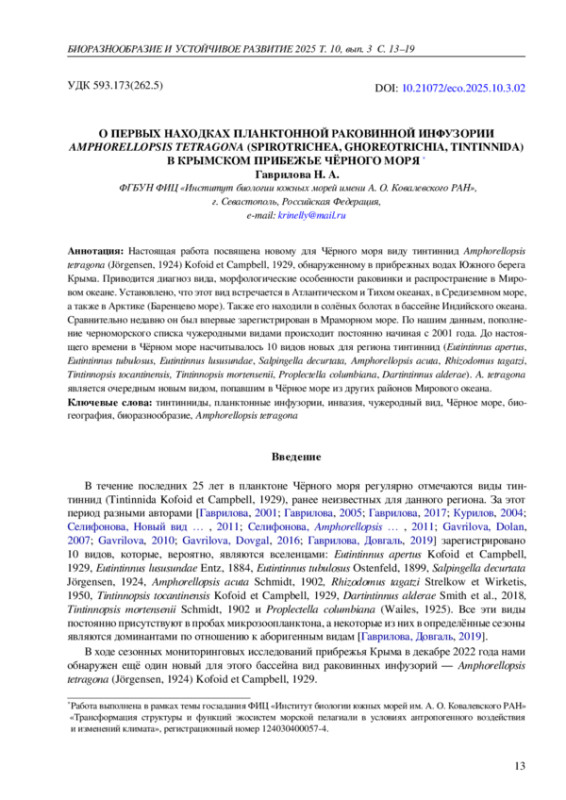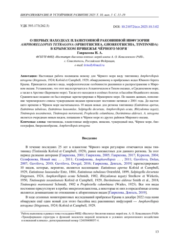 Настоящая работа посвящена новому для Чёрного моря виду тинтиннид Amphorellopsis tetragona (Jörgensen, 1924) Kofoid et Campbell, 1929, обнаруженному в прибрежных водах Южного берега Крыма. Приводится диагноз вида, морфологические особенности раковинки и распространение в Мировом океане. Установлено, что этот вид встречается в Атлантическом и Тихом океанах, в Средиземном море, а также в Арктике (Баренцево море). Также его находили в солёных болотах в бассейне Индийского океана. Сравнительно недавно он был впервые зарегистрирован в Мраморном море. По нашим данным, пополнение черноморского списка чужеродными видами происходит постоянно начиная с 2001 года. До настоящего времени в Чёрном море насчитывалось 10 видов новых для региона тинтиннид (Eutintinnus apertus, Eutintinnus tubulosus, Eutintinnus lususundae, Salpingella decurtata, Amphorellopsis acuta, Rhizodomus tagatzi, Tintinnopsis tocantinensis, Tintinnopsis mortensenii, Proplectella сolumbiana, Dartintinnus alderae). A. tetragona является очередным новым видом, попавшим в Чёрное море из других районов Мирового океана.