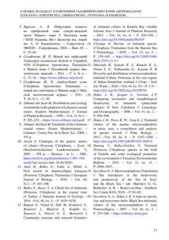 12. Balkıs N., Koray T. A. Check-list of tintinnids (Protozoa: Ciliophora) in the coastal zone of Turkey // Pakistan Journal of Zoology. - 2014. -Vol. 46, iss. 4. - P. 1029-1038.