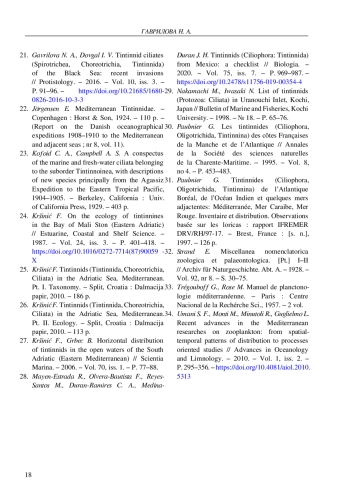 20. Gavrilova N. A., Dolan J. R. A note on species lists and ecosystem shifts: Black Sea tintinnids, ciliates of the microzooplankton // Acta Protozoologica. - 2007. - Vol. 46, iss. 4. - P. 279-288. -.