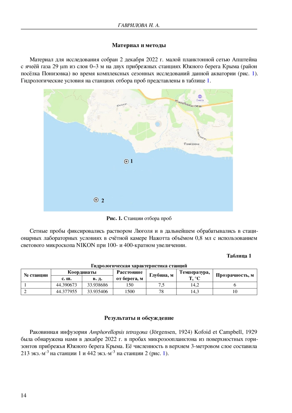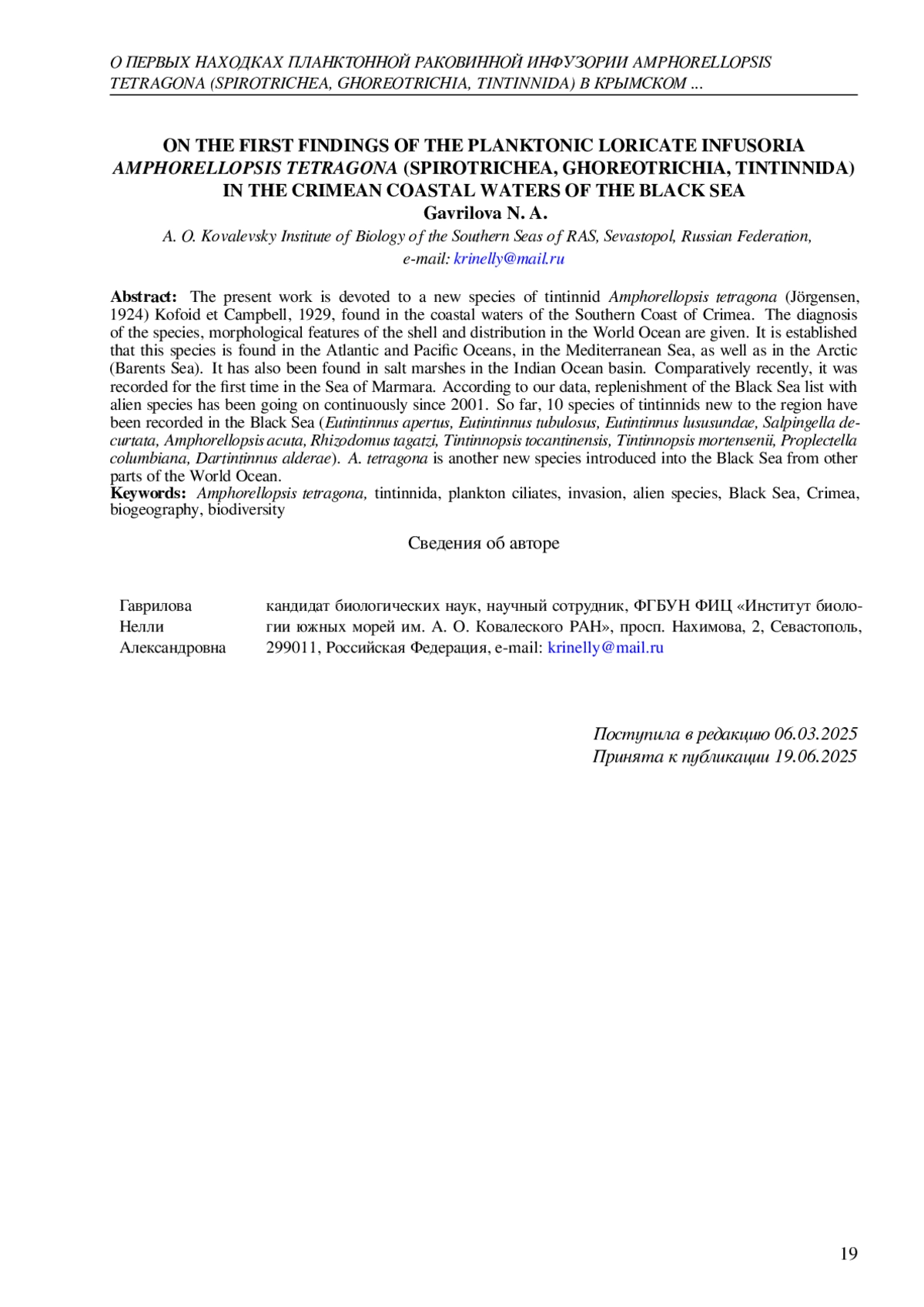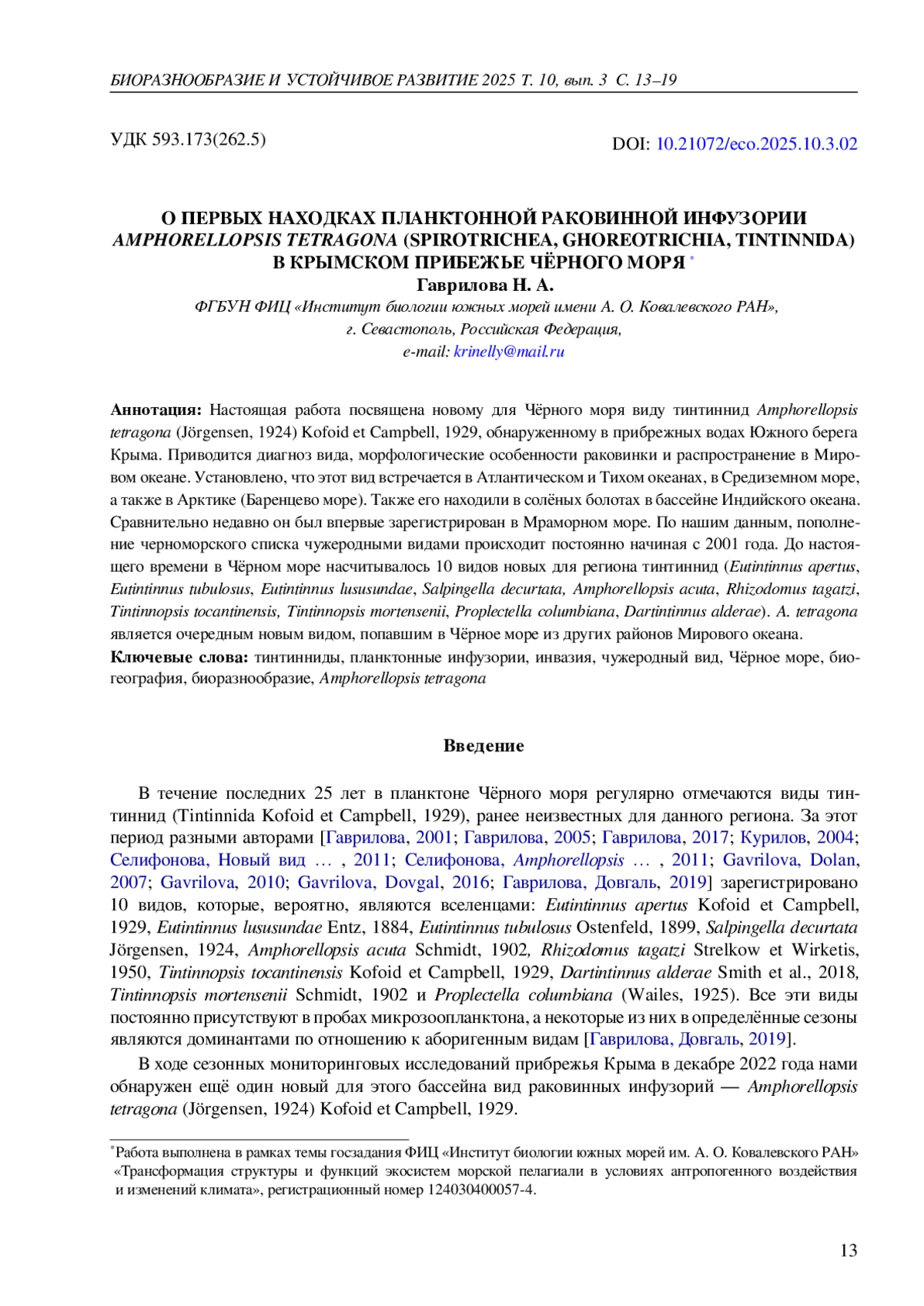 2. Гаврилова Н. А. Об обнаружении нового вида тинтиннид Tintinnopsis mortensenii Schmidt, 1902 (Spirotrichea, Choreotrichia, Tintinnida, Codonellididae) в планктоне бухты Севастопольская (Чёрное море) // Морской биологический журнал. - 2017. - Т. 2, № 1. - С. 86-87. -. DOI: 10.21072/mbj.2017.02.1.09