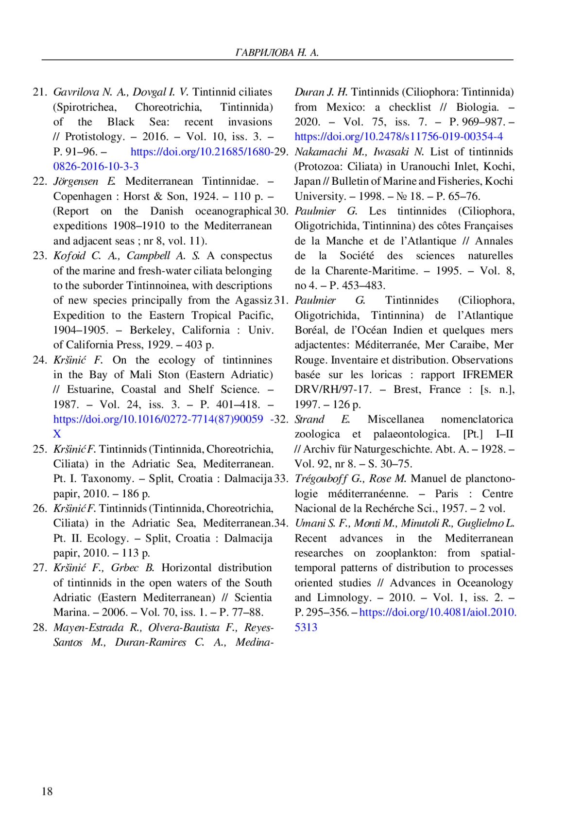 21. Gavrilova N. A., Dovgal I. V. Tintinnid ciliates (Spirotrichea, Choreotrichia, Tintinnida) of the Black Sea: recent invasions // Protistology. - 2016. - Vol. 10, iss. 3. - P. 91-96. -. DOI: 10.21685/1680-0826-2016-10-3-3