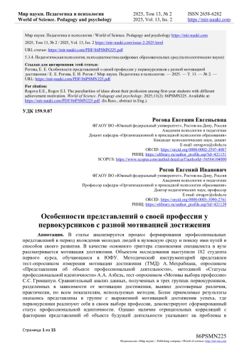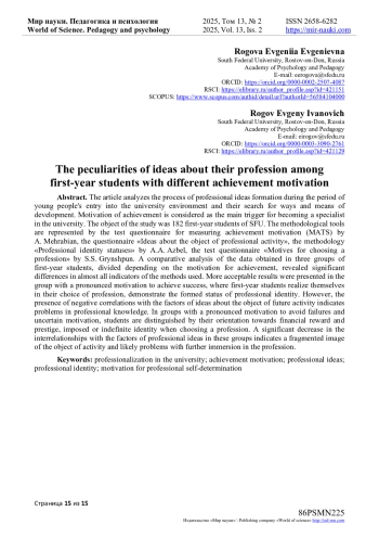 Объектом исследования выступили 182 студента первого курса, обучающиеся в ЮФУ. Методический инструментарий представлен тест-опросником измерения мотивации достижения (ТМД) А. Мехрабиана, опросником «Представления об объекте профессиональной деятельности», методикой «Статусы профессиональной идентичности» А. А. Азбель, тест-опросником «Мотивы выбора профессии» С. С. Гриншпун. Сравнительный анализ данных, полученных в трех группах первокурсников, разделенных в зависимости от мотивации достижения, выявил достоверные различия, практически, по всем показателям, используемых методик. Более приемлемые результаты оказались представлены в группе с выраженной мотивацией достижения успеха, где первокурсники реализуют себя в своем выборе профессии, демонстрируют сформированный статус профессиональной идентичности. Однако наличие отрицательных корреляций с факторами представлений об объекте будущей деятельности указывают на проблемы в профессиональных знаниях. В группах с выраженной мотивацией избегания неудач и неопределенной мотивацией студентов отличает ориентация при выборе профессии на материальное вознаграждение и престиж, навязанная или неопределенная идентичность. Существенное уменьшение взаимосвязей с факторами профессиональных представлений в данных группах свидетельствует о фрагментарном образе объекта деятельности и вероятных проблемах при дальнейшем погружении в профессию.