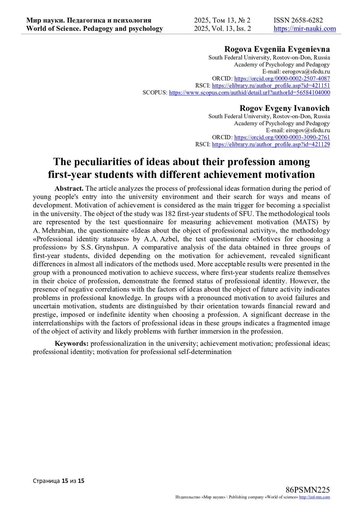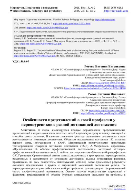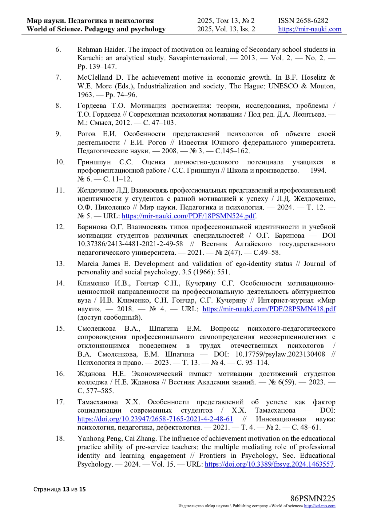 11. Желдоченко Л.Д. Взаимосвязь профессиональных представлений и профессиональной идентичности у студентов с разной мотивацией к успеху / Л.Д. Желдоченко, О.Ф. Николенко // Мир науки. Педагогика и психология. - 2024. - Т. 12. - № 5. - URL: https://mir-nauki.com/PDF/18PSMN524.pdf. EDN: SFDVUM