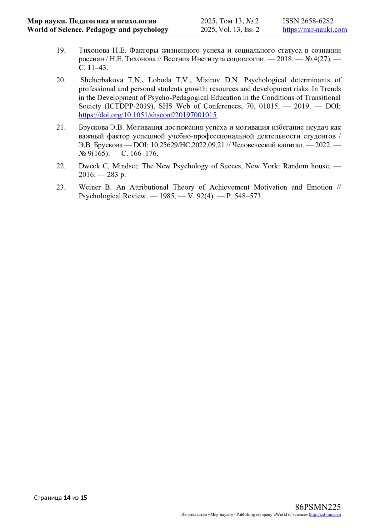 20. Shcherbakova T.N., Loboda T.V., Misirov D.N. Psychological determinants of professional and personal students growth: resources and development risks. In Trends in the Development of Psycho-Pedagogical Education in the Conditions of Transitional Society (ICTDPP-2019). SHS Web of Conferences, 70, 01015. - 2019. -. DOI: 10.1051/shsconf/20197001015 EDN: FDHEDK