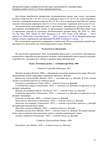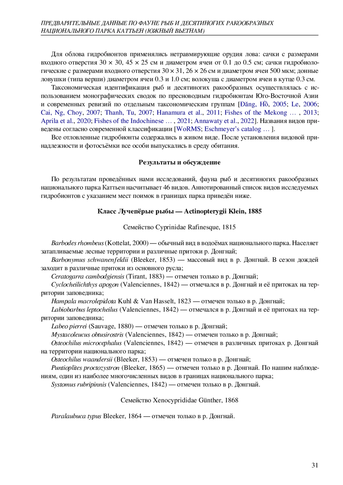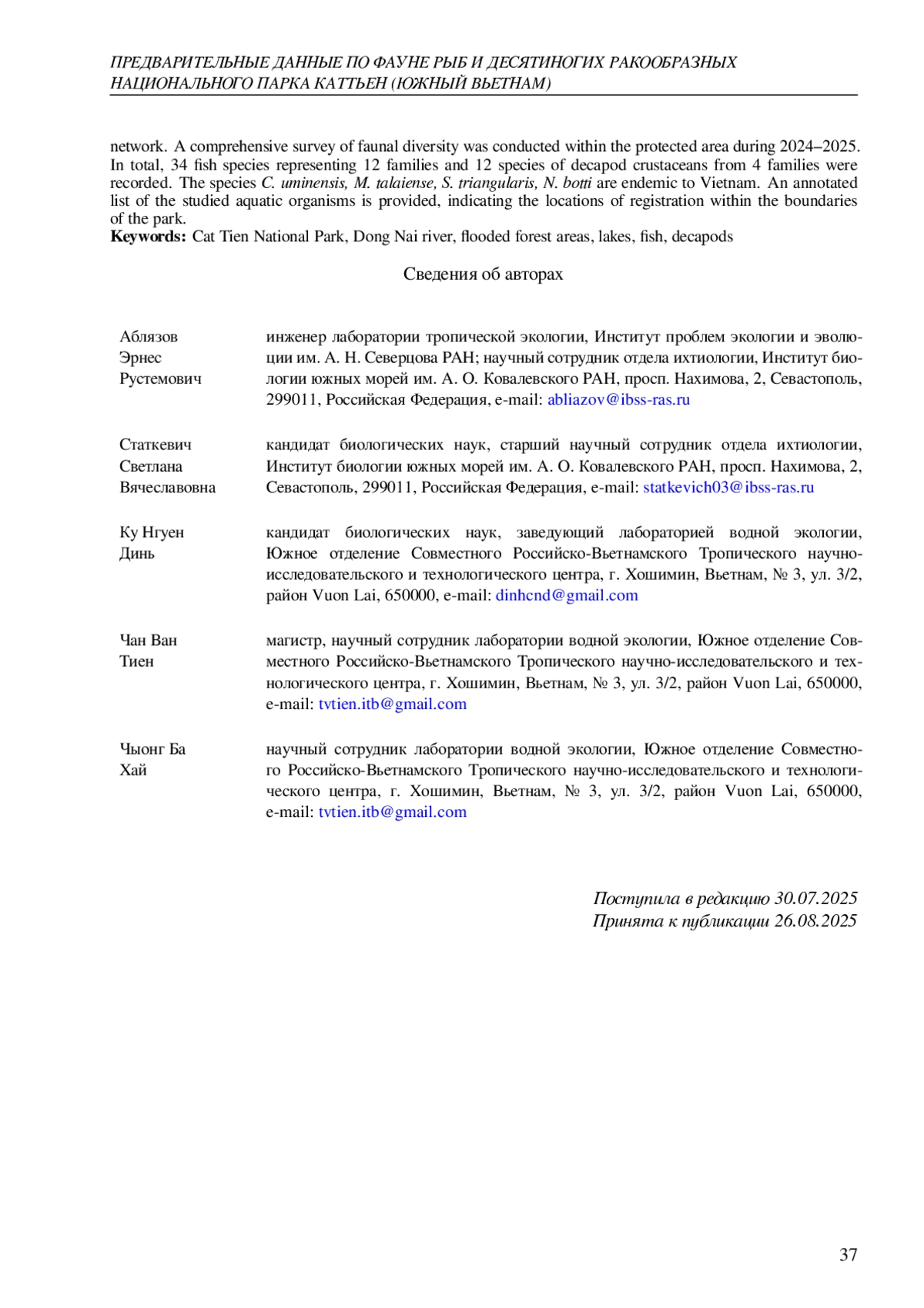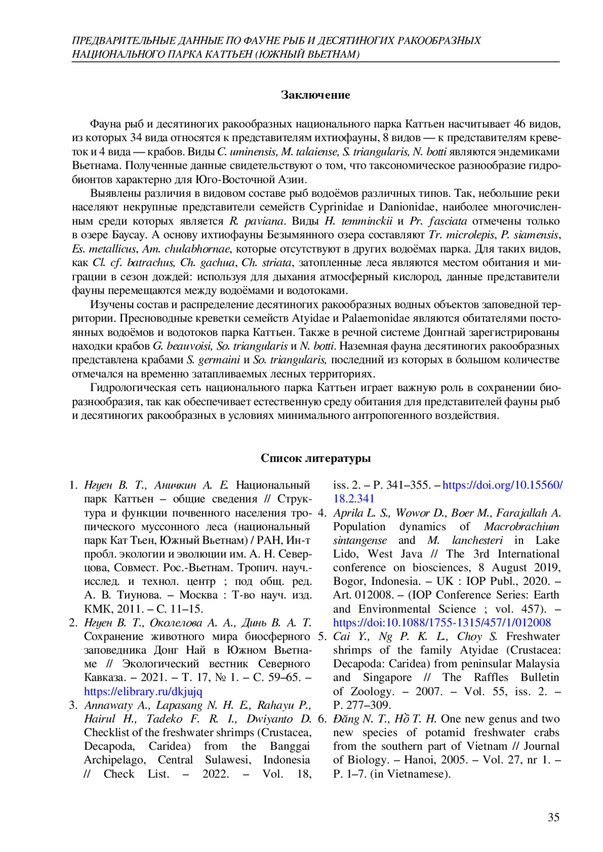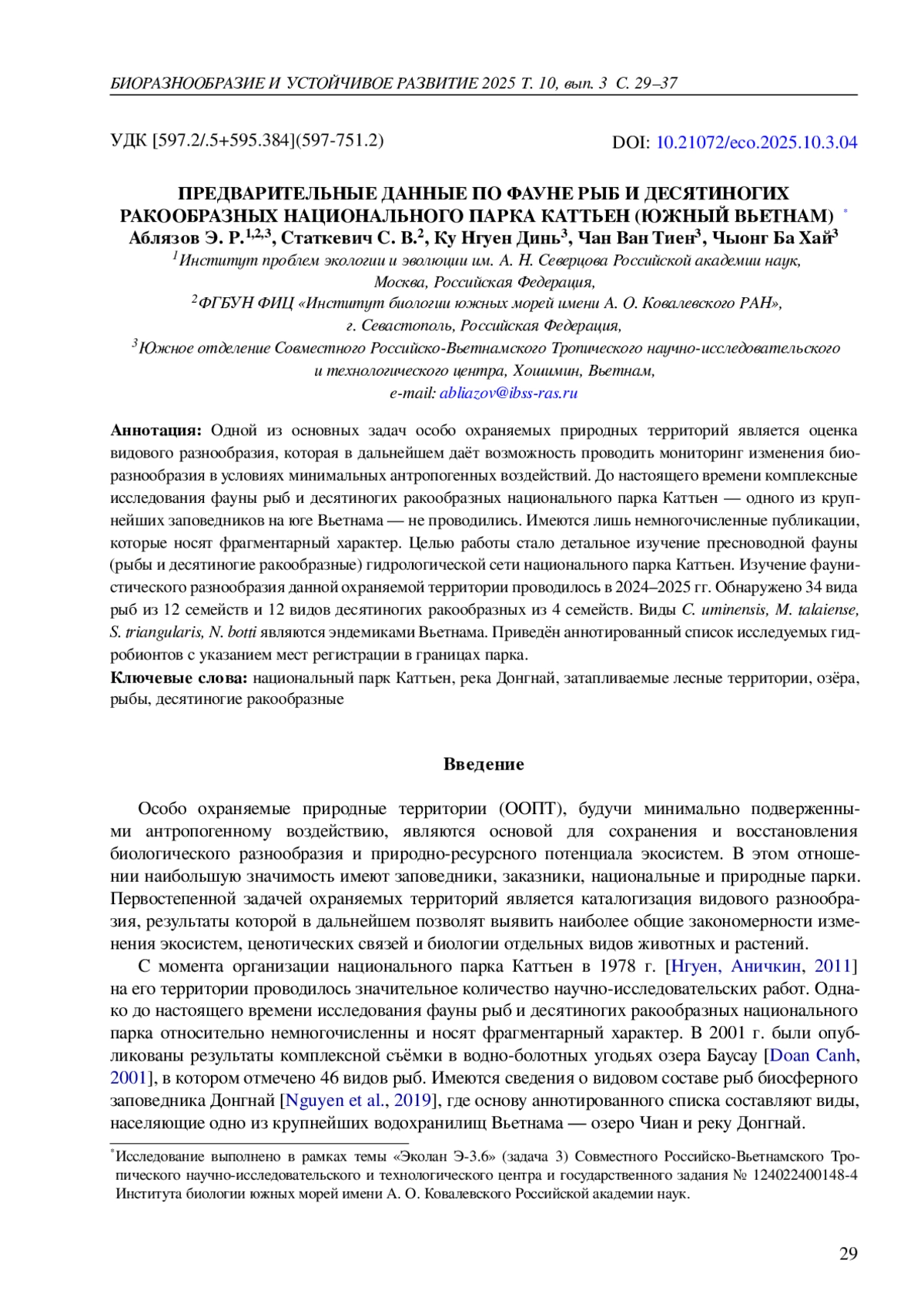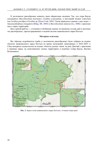 Одной из основных задач особо охраняемых природных территорий является оценка видового разнообразия, которая в дальнейшем даёт возможность проводить мониторинг изменения биоразнообразия в условиях минимальных антропогенных воздействий. До настоящего времени комплексные исследования фауны рыб и десятиногих ракообразных национального парка Каттьен — одного из крупнейших заповедников на юге Вьетнама — не проводились. Имеются лишь немногочисленные публикации, которые носят фрагментарный характер. Целью работы стало детальное изучение пресноводной фауны (рыбы и десятиногие ракообразные) гидрологической сети национального парка Каттьен. Изучение фаунистического разнообразия данной охраняемой территории проводилось в 2024–2025 гг. Обнаружено 34 вида рыб из 12 семейств и 12 видов десятиногих ракообразных из 4 семейств. Виды C. uminensis, M. talaiense, S. triangularis, N. botti являются эндемиками Вьетнама. Приведён аннотированный список исследуемых гидробионтов с указанием мест регистрации в границах парка.