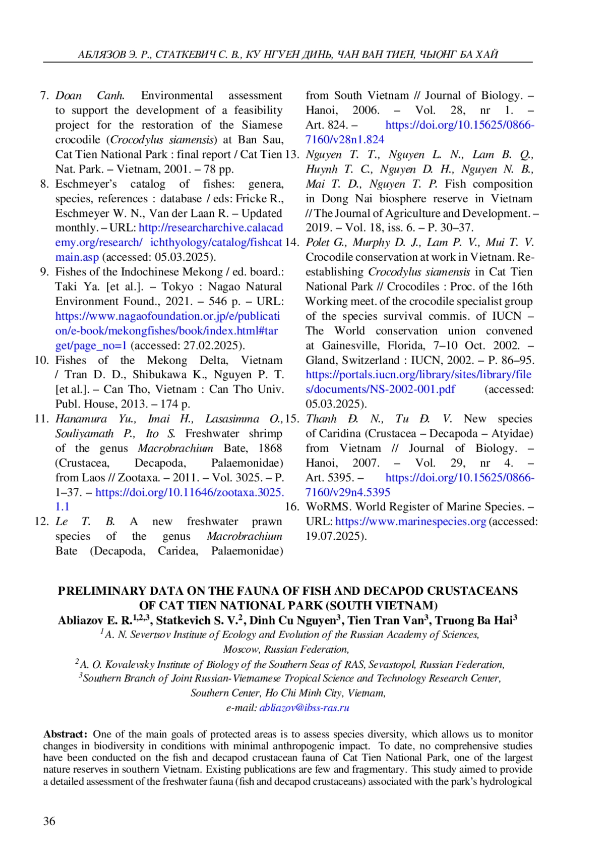 12. Le T. B. A new freshwater prawn species of the genus Macrobrachium Bate (Decapoda, Caridea, Palaemonidae) from South Vietnam // Journal of Biology. - Hanoi, 2006. - Vol. 28, nr 1. - Art. 824. -. DOI: 10.15625/0866-7160/v28n1.824