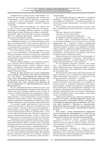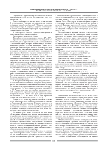Сопоставительный анализ стихотворений Тургенева «В дороге» и С. Я. Надсона «Прошлого времени тени туманные» позволил рассмотреть особенности использования приема реминисценции в произведении поэта эпохи безвременья. Определена общность мотива воспоминаний, присущих обоим текстам, настроений и мелодики; выявлены различия на уровне реализации основного смысла текстов.