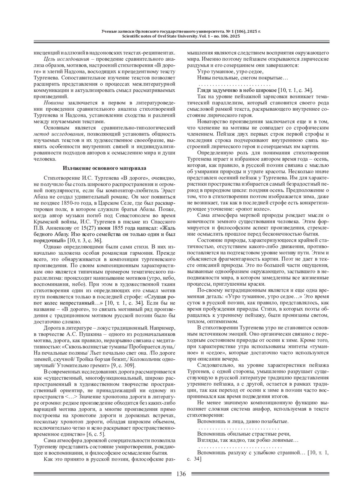 В статье проведен анализ образной системы, мотивов и средств их выражения в стихотворении И. С. Тургенева «В дороге». Установлено, что в основе композиции произведения лежит принцип тематического параллелизма, обусловленный повтором образа неба. Ведущую роль в стихотворении играют мотивы воспоминаний и дороги, являющиеся традиционными для русской литературы.