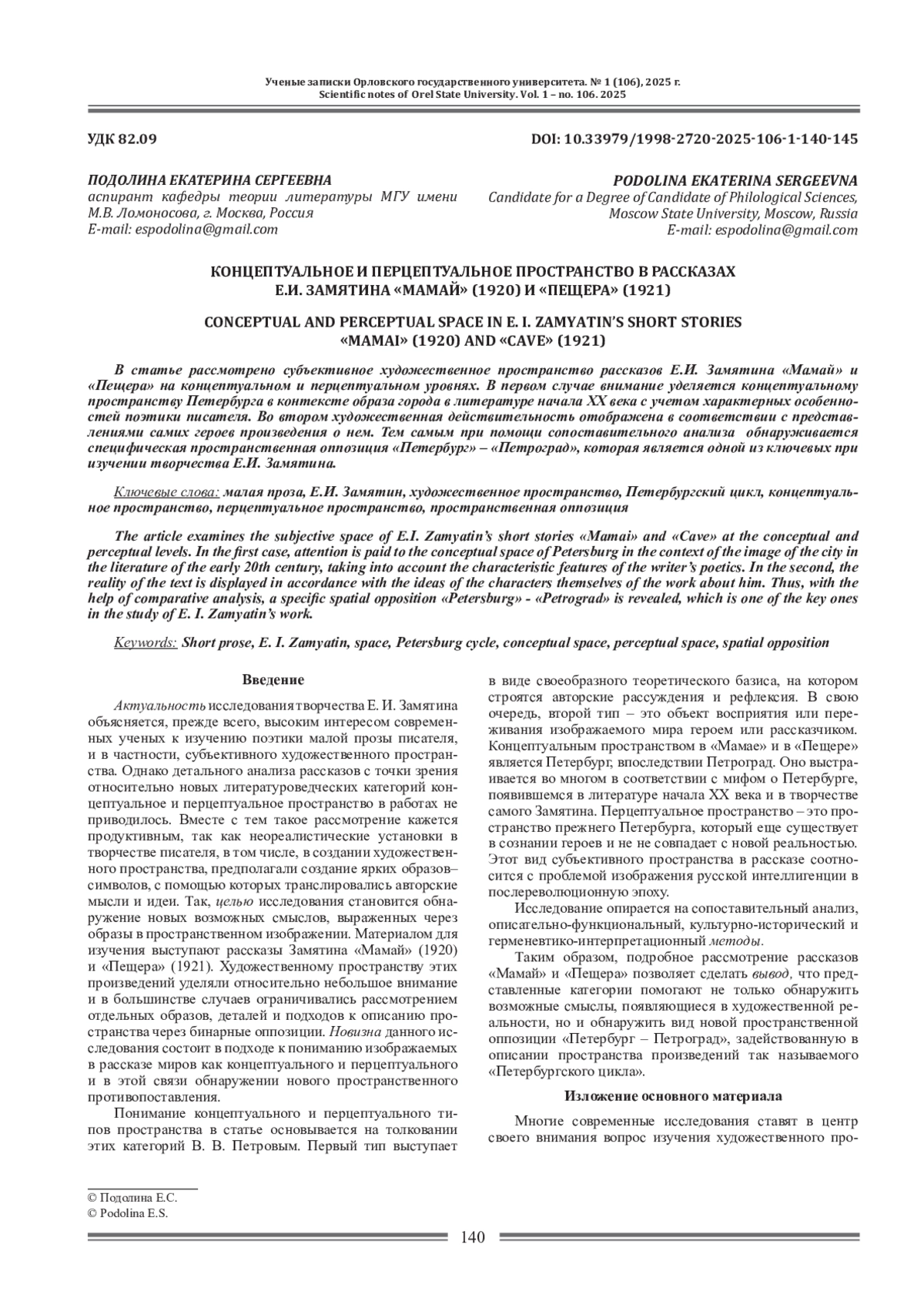 Актуальность исследования творчества Е. И. Замятина объясняется, прежде всего, высоким интересом современных ученых к изучению поэтики малой прозы писателя, и в частности, субъективного художественного пространства. Однако детального анализа рассказов с точки зрения относительно новых литературоведческих категорий концептуальное и перцептуальное пространство в работах не приводилось.