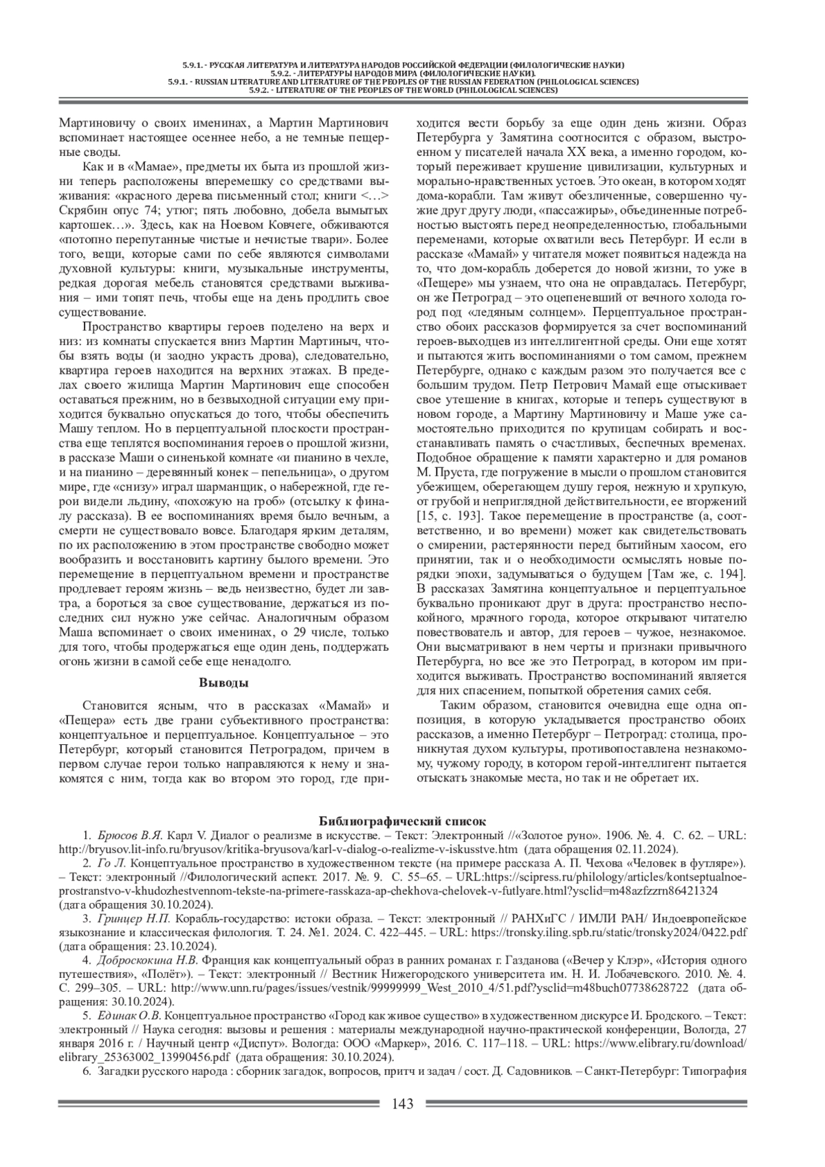5. Единак О.В. Концептуальное пространство “Город как живое существо” в художественном дискурсе И. Бродского. - Текст: электронный // Наука сегодня: вызовы и решения: материалы международной научно-практической конференции, Вологда, 27 января 2016 г. / Научный центр “Диспут”. Вологда: ООО “Маркер”, 2016. С. 117-118. - URL: download/elibrary_25363002_13990456.pdf (дата обращения: 30.10.2024). EDN: VJAMIT