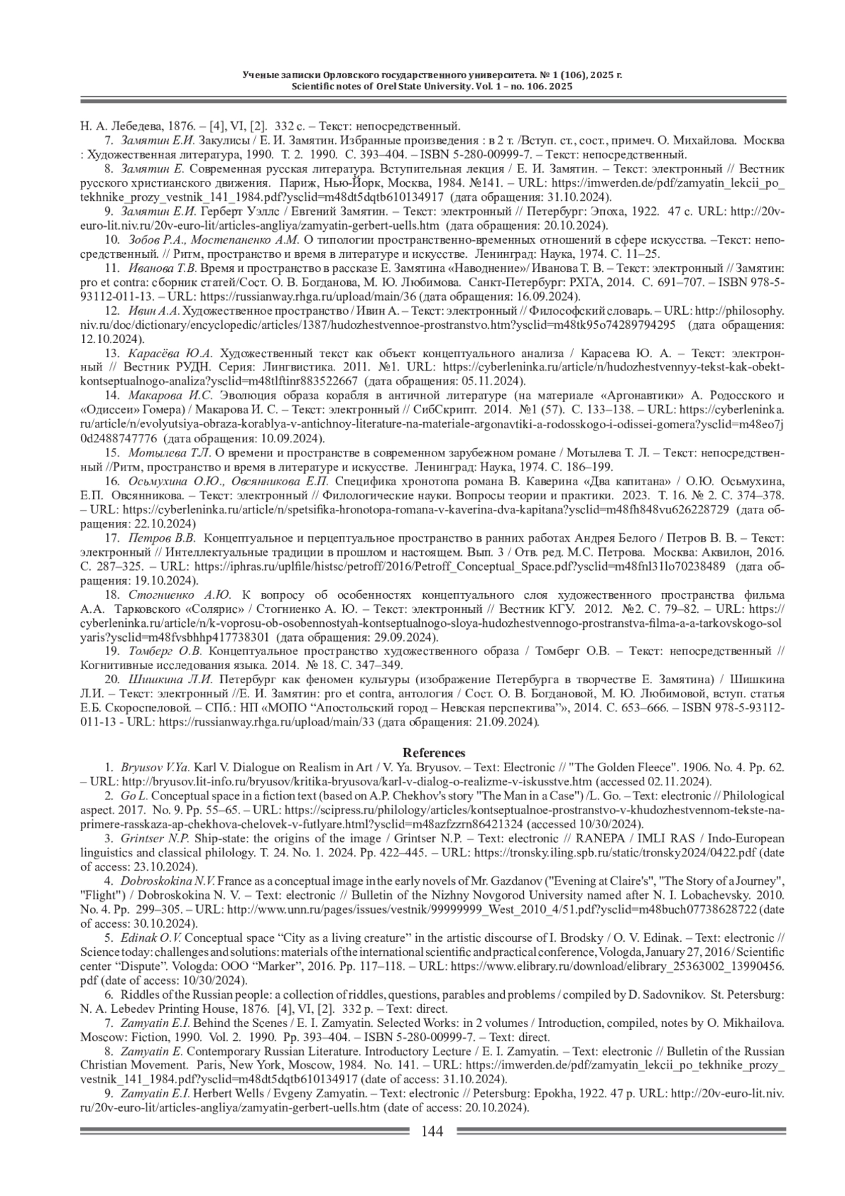 8. Замятин Е. Современная русская литература. Вступительная лекция / Е. И. Замятин. - Текст: электронный // Вестник русского христианского движения. Париж, Нью-Йорк, Москва, 1984. №141. - URL: https://imwerden.de/pdf/zamyatin_lekcii_po_tekhnike_prozy_vestmk_141_1984.pdf?ysclid=m48dt5dqtb610134917 (дата обращения: 31.10.2024).