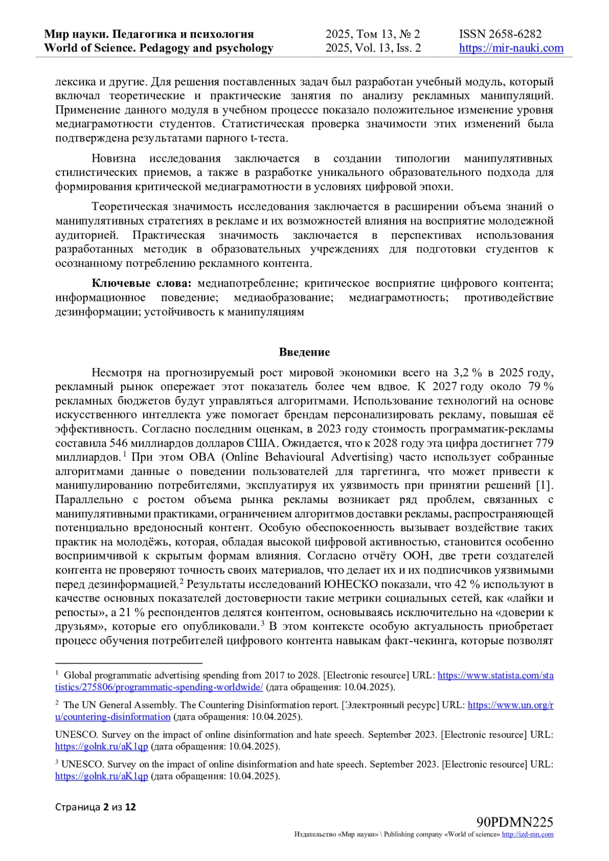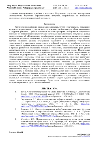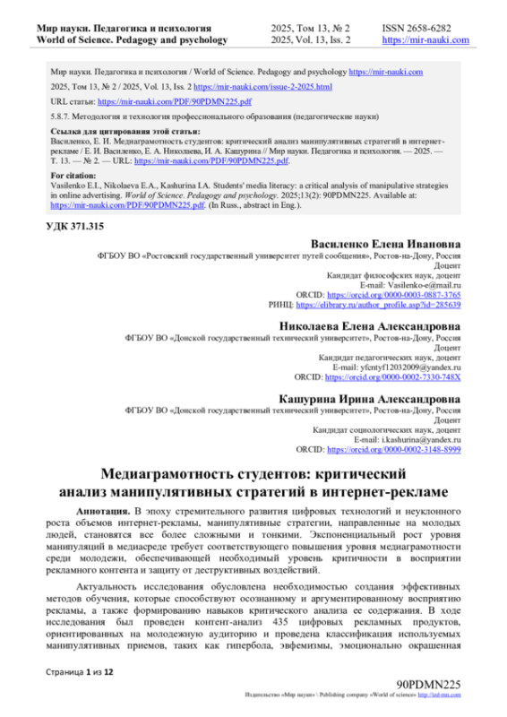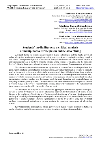 В эпоху стремительного развития цифровых технологий и неуклонного роста объемов интернет-рекламы, манипулятивные стратегии, направленные на молодых людей, становятся все более сложными и тонкими. Экспоненциальный рост уровня манипуляций в медиасреде требует соответствующего повышения уровня медиаграмотности среди молодежи, обеспечивающей необходимый уровень критичности в восприятии рекламного контента и защиту от деструктивных воздействий. Актуальность исследования обусловлена необходимостью создания эффективных методов обучения, которые способствуют осознанному и аргументированному восприятию рекламы, а также формированию навыков критического анализа ее содержания. В ходе исследования был проведен контент-анализ 435 цифровых рекламных продуктов, ориентированных на молодежную аудиторию и проведена классификация используемых манипулятивных приемов, таких как гипербола, эвфемизмы, эмоционально окрашенная лексика и другие. Для решения поставленных задач был разработан учебный модуль, который включал теоретические и практические занятия по анализу рекламных манипуляций. Применение данного модуля в учебном процессе показало положительное изменение уровня медиаграмотности студентов. Статистическая проверка значимости этих изменений была подтверждена результатами парного t-теста. Новизна исследования заключается в создании типологии манипулятивных стилистических приемов, а также в разработке уникального образовательного подхода для формирования критической медиаграмотности в условиях цифровой эпохи. Теоретическая значимость исследования заключается в расширении объема знаний о манипулятивных стратегиях в рекламе и их возможностей влияния на восприятие молодежной аудиторией. Практическая значимость заключается в перспективах использования разработанных методик в образовательных учреждениях для подготовки студентов к осознанному потреблению рекламного контента.