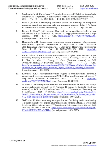 9. Lin L. Effects of Media Literacy Intervention on Weight-Control Products Digital Marketing Targeting Adolescents / L. Lin, F. Chang, T. Huang, T. Chen, Ch. Chiu, P. Chen, N. Miao, H. Chuang, H. Chen [Electronic resource] - // Behavioral Sciences. - 2024. - Т. 14(11). - URL: https://www.researchgate.net/publication/385478976_Effects_of_Media_Literacy_Intervention_on_Weight-Control_Products_Digital_Marketing_Targeting_Adolescents (дата обращения: 10.04.2025). DOI: 10.3390/bs14111023 EDN: NHQHII