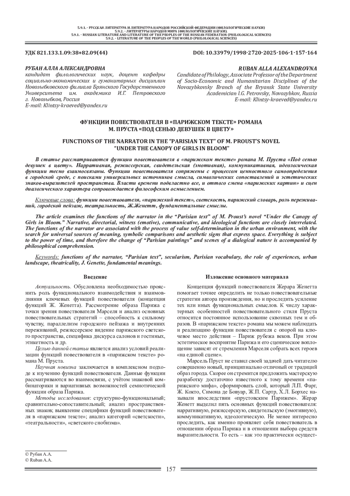 Актуальность. Обусловлена необходимостью прояснить роль функционального взаимодействия и взаимовлияния ключевых функций повествователя (концепция функций Ж. Женетта). Рассмотрение образа Парижа с точки зрения повествователя Марселя и анализ основных повествовательных стратегий – способность к сильному чувству, параллелизм городского пейзажа и внутренних переживаний, режиссерское видение парижского светского пространства, специфика дискурса салонов и гостиных, этикетность и др.