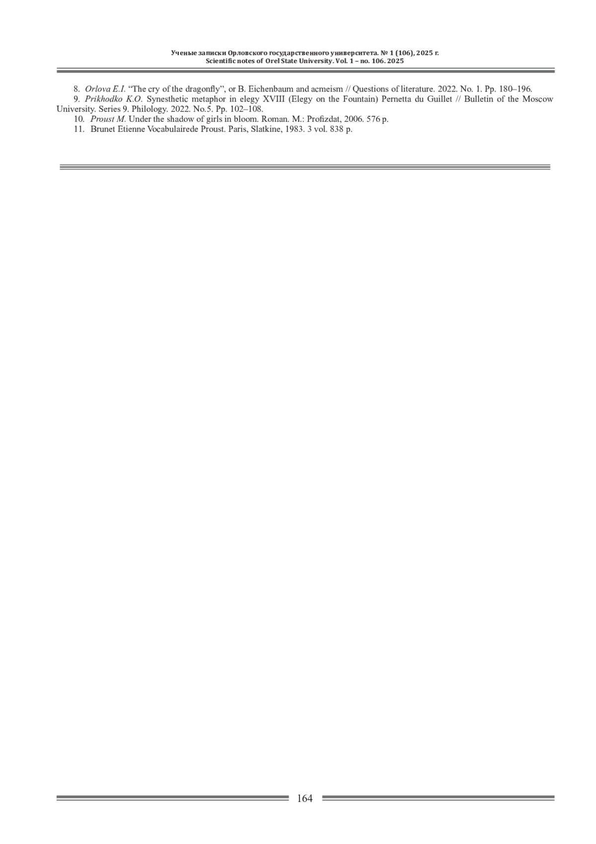 9. Приходько К.О. Синестетическая метафора в элегии ХЫП(Элегии о Фонтане) Пернетты дю Гийе // Вестник Московского университета. Серия 9. Филология. 2022. №5. С. 102-108. EDN: HLYCON