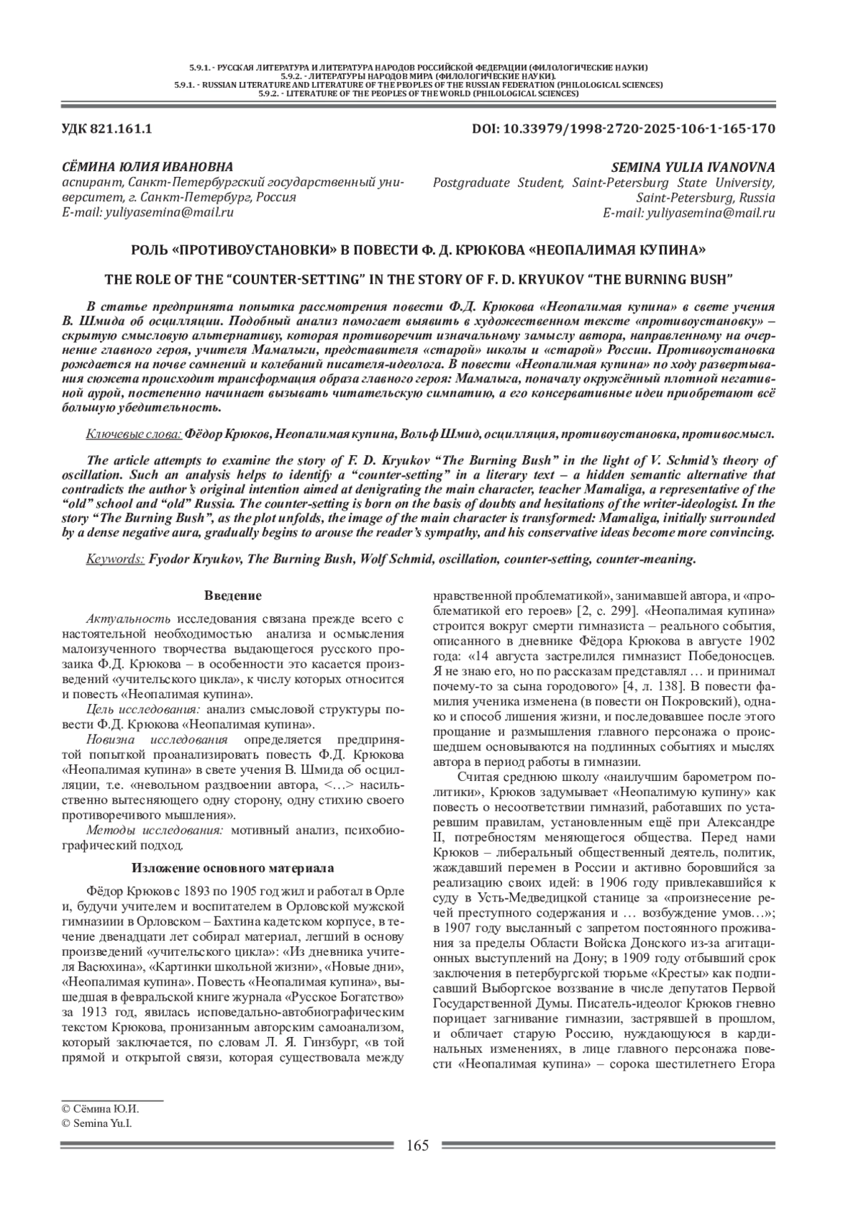 В статье предпринята попытка рассмотрения повести Ф. Д. Крюкова «Неопалимая купина» в свете учения В. Шмида об осцилляции. Подобный анализ помогает выявить в художественном тексте «противоустановку» -скрытую смысловую альтернативу, которая противоречит изначальному замыслу автора, направленному на очернение главного героя, учителя Мамалыги, представителя «старой» школы и «старой» России. Противоустановка рождается на почве сомнений и колебаний писателя-идеолога. В повести «Неопалимая купина» по ходу развертывания сюжета происходит трансформация образа главного героя: Мамалыга, поначалу окружённый плотной негативной аурой, постепенно начинает вызывать читательскую симпатию, а его консервативные идеи приобретают всё большую убедительность.