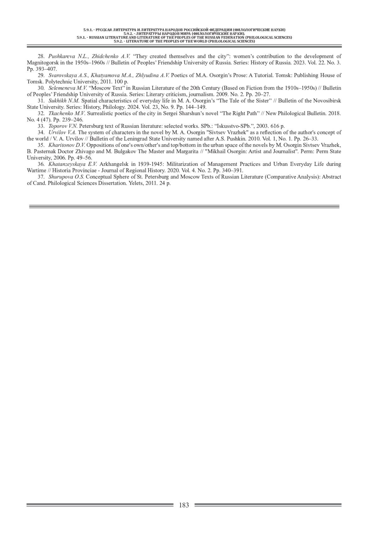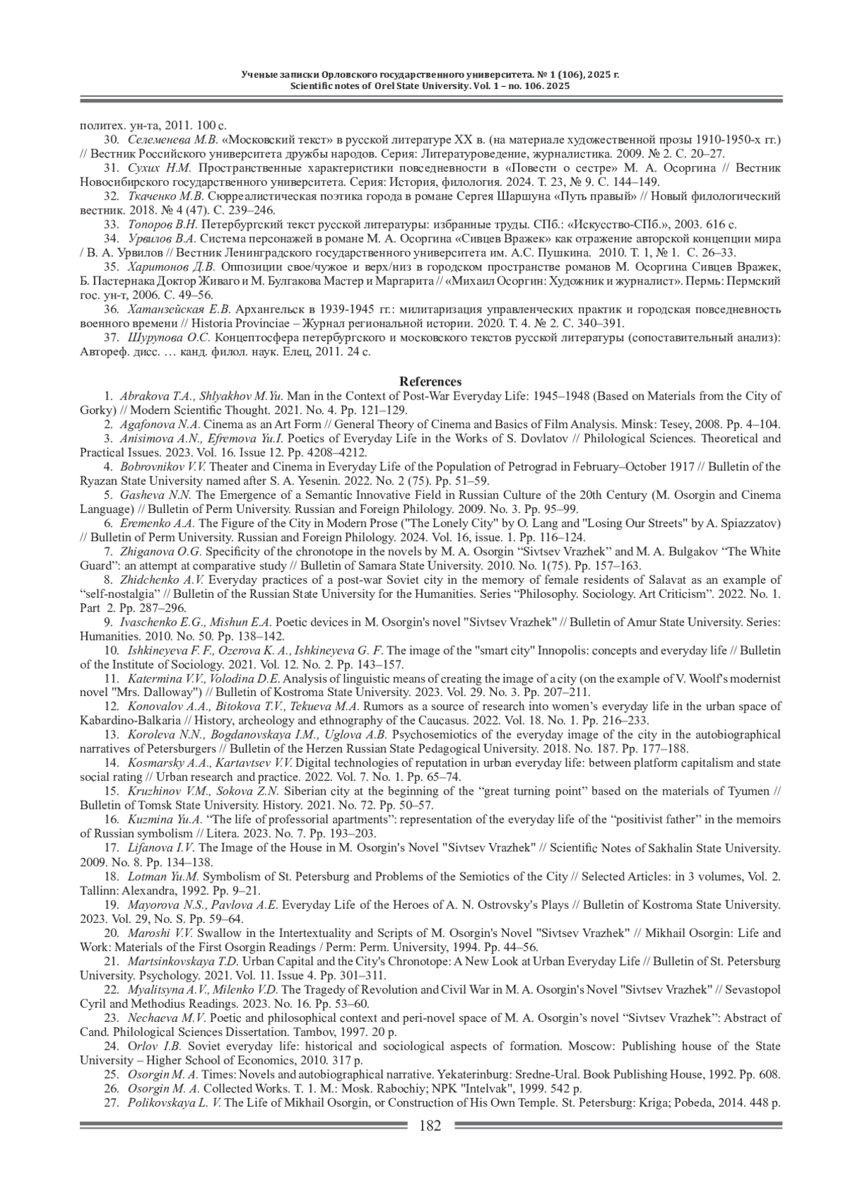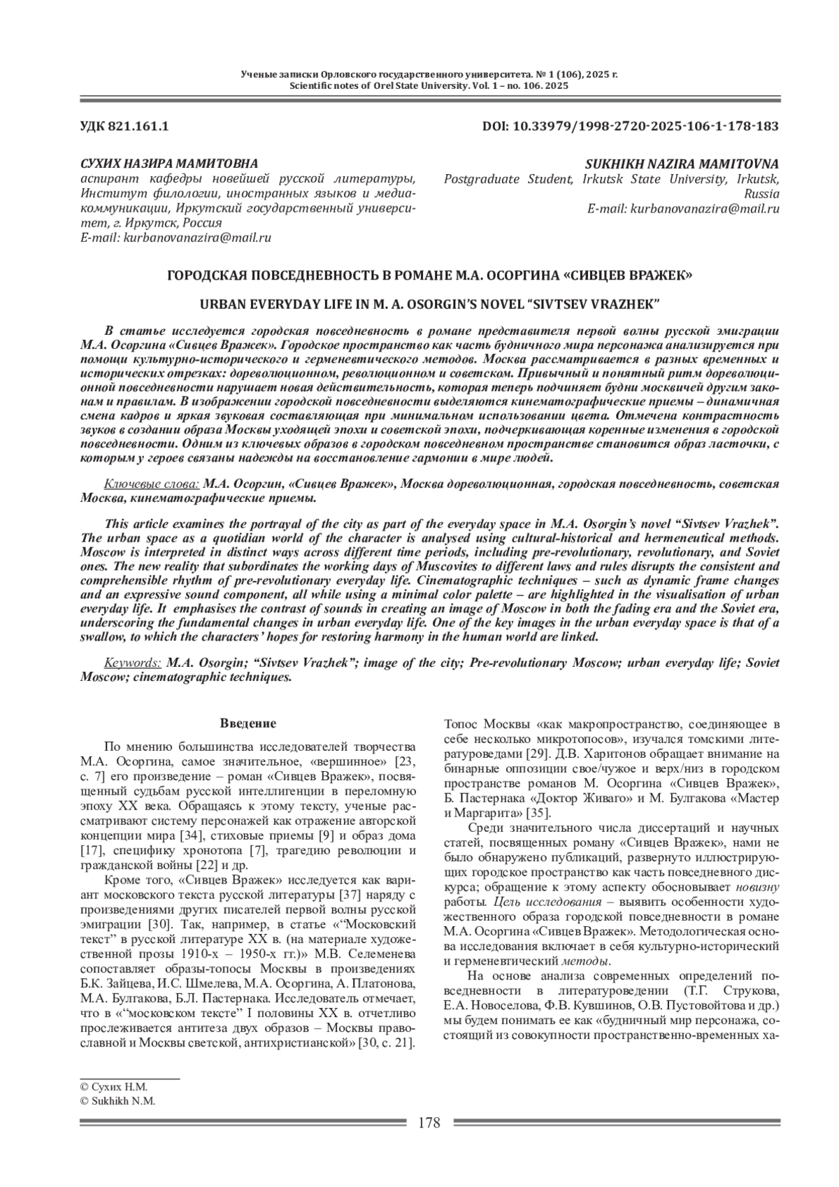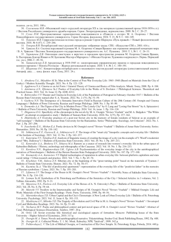 31. Сухих Н.М. Пространственные характеристики повседневности в “Повести о сестре” М. А. Осоргина // Вестник Новосибирского государственного университета. Серия: История, филология. 2024. Т 23, № 9. С. 144-149. EDN: UMJNTN