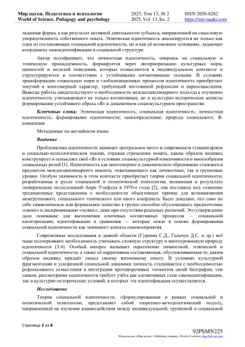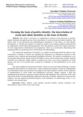 Рассматривается значение нарратива как когнитивного инструмента, посредством которого осуществляется рефлексивное самоконструирование идентичности, включая интеграцию противоречивых элементов жизненного опыта в когерентную и осмысленную биографическую структуру. Нарративная конфигурация выступает при этом не как внешне заданная форма, а как результат активной деятельности субъекта, направленной на смысловую упорядоченность собственного опыта. Этническая идентичность анализируется не только как одна из составляющих социальной идентичности, но и как её возможное основание, задающее координаты самоидентификации в социальной структуре.