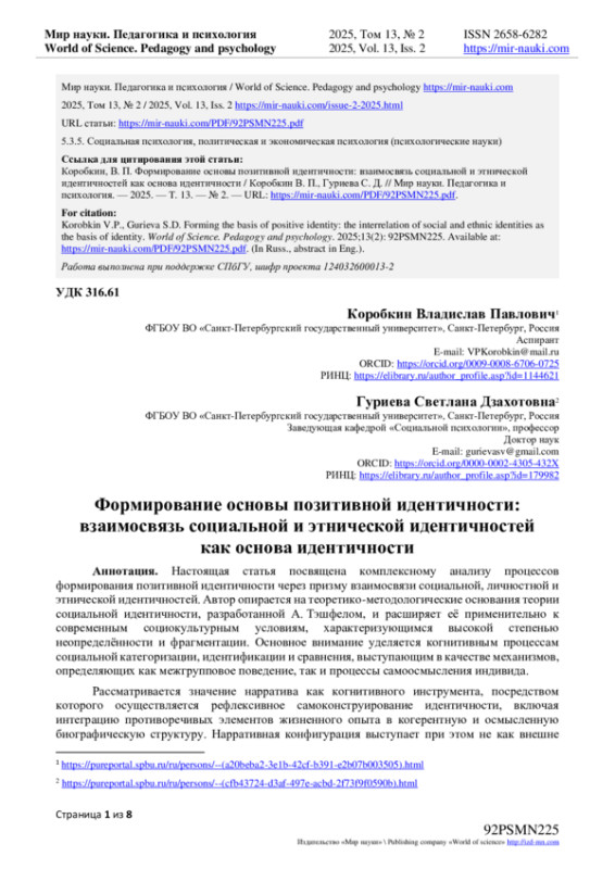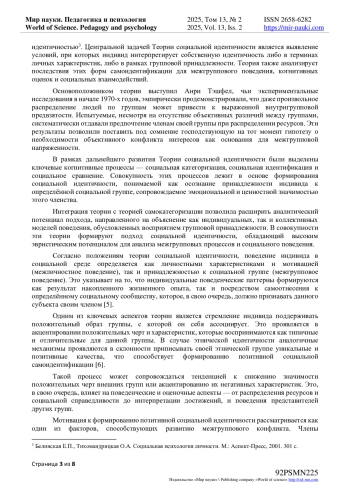 Настоящая статья посвящена комплексному анализу процессов формирования позитивной идентичности через призму взаимосвязи социальной, личностной и этнической идентичностей. Автор опирается на теоретико-методологические основания теории социальной идентичности, разработанной А. Тэшфелом, и расширяет её применительно к современным социокультурным условиям, характеризующимся высокой степенью неопределённости и фрагментации. Основное внимание уделяется когнитивным процессам социальной категоризации, идентификации и сравнения, выступающим в качестве механизмов, определяющих как межгрупповое поведение, так и процессы самоосмысления индивида.